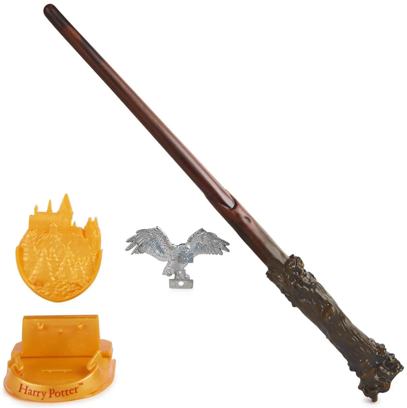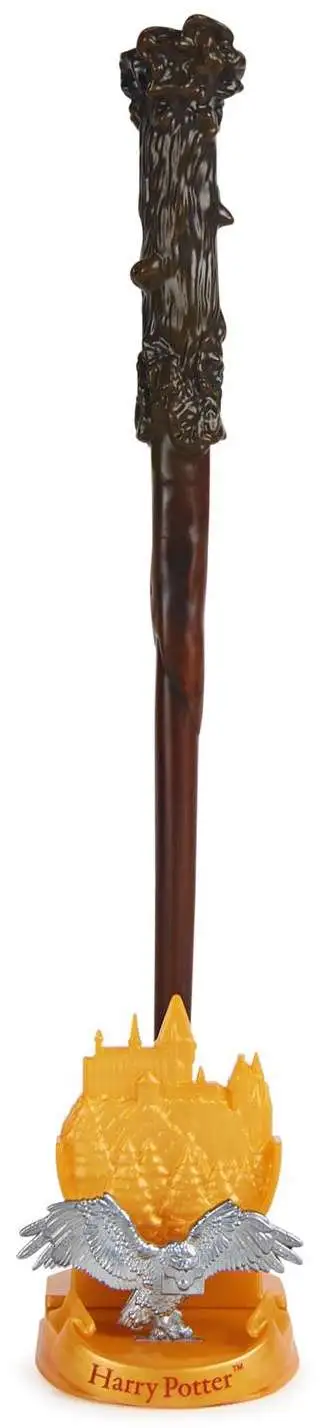 - Each detailed wand has a metallic gold Hogwarts stand with the character's name and a unique die-cast accessory Hedwig with Harry`s, Crookshanks with Hermione's and more!