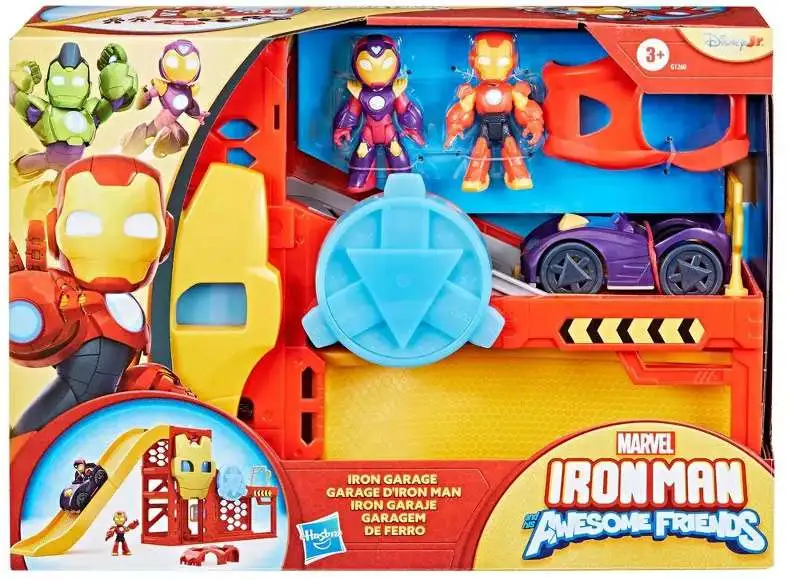 - MARVEL IRON MAN PLAYSET: Kids ages 3 and up can imagine armoring up to save the day, with the Iron Garage, featuring detail and design inspired by the Disney Jr. series Iron Man and his Awesome Friends