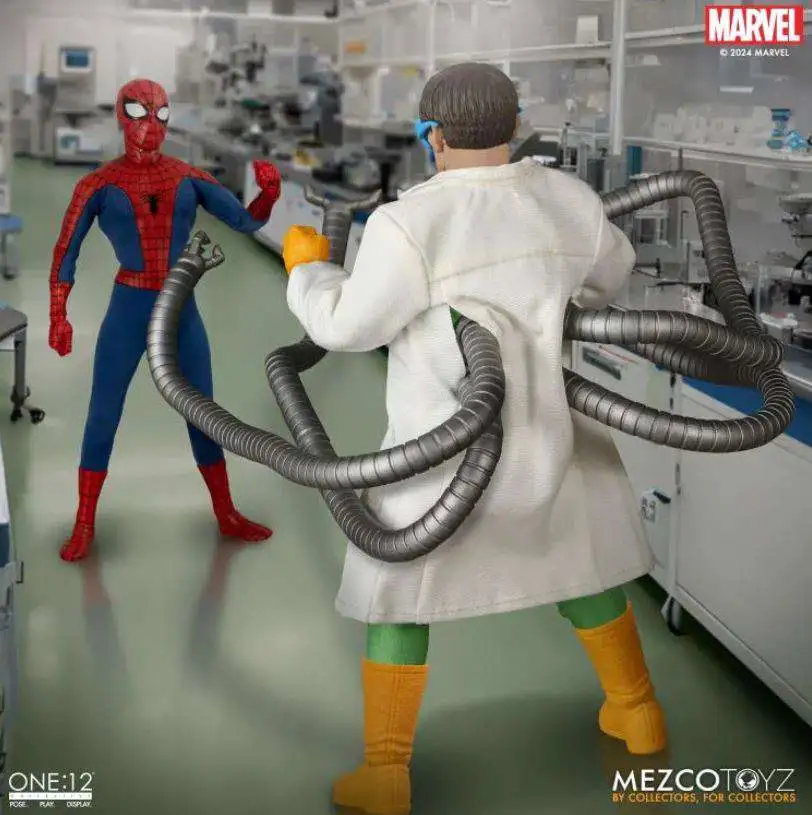Straight from the comic pages, the One:12 Collective Doctor Octopus is dressed in his classic green bodysuit, featuring a removable lab coat and three interchangeable head portraits in varying expressions. The maniacal menace wields his signature weapon sets of four highly posable, tentacle-like arms in different lengths that are assembled on his back, complete with multiple interchangeable claws for each arm.