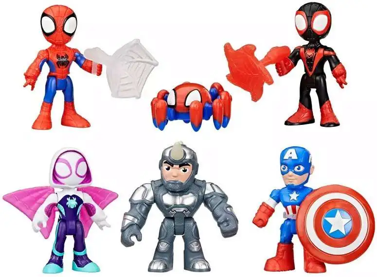 - POSEABLE 3-INCH (7.6 CM) HERO FIGURES: This action figure set includes articulated Spidey, Miles "Spin" Morales, Ghost-Spider, as well as Captain America: Steve Rogers with shield accessory and Rhino toy figures
