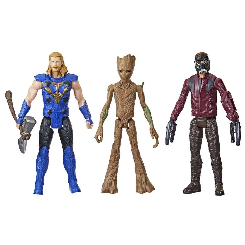 - The Marvel Studios' Thor: Love and Thunder Titan Hero Series action figure 3-pack includes Thor, Groot, and Star-Lord action figures