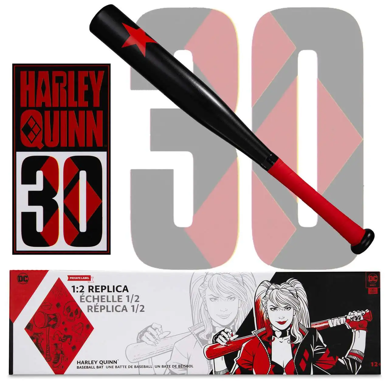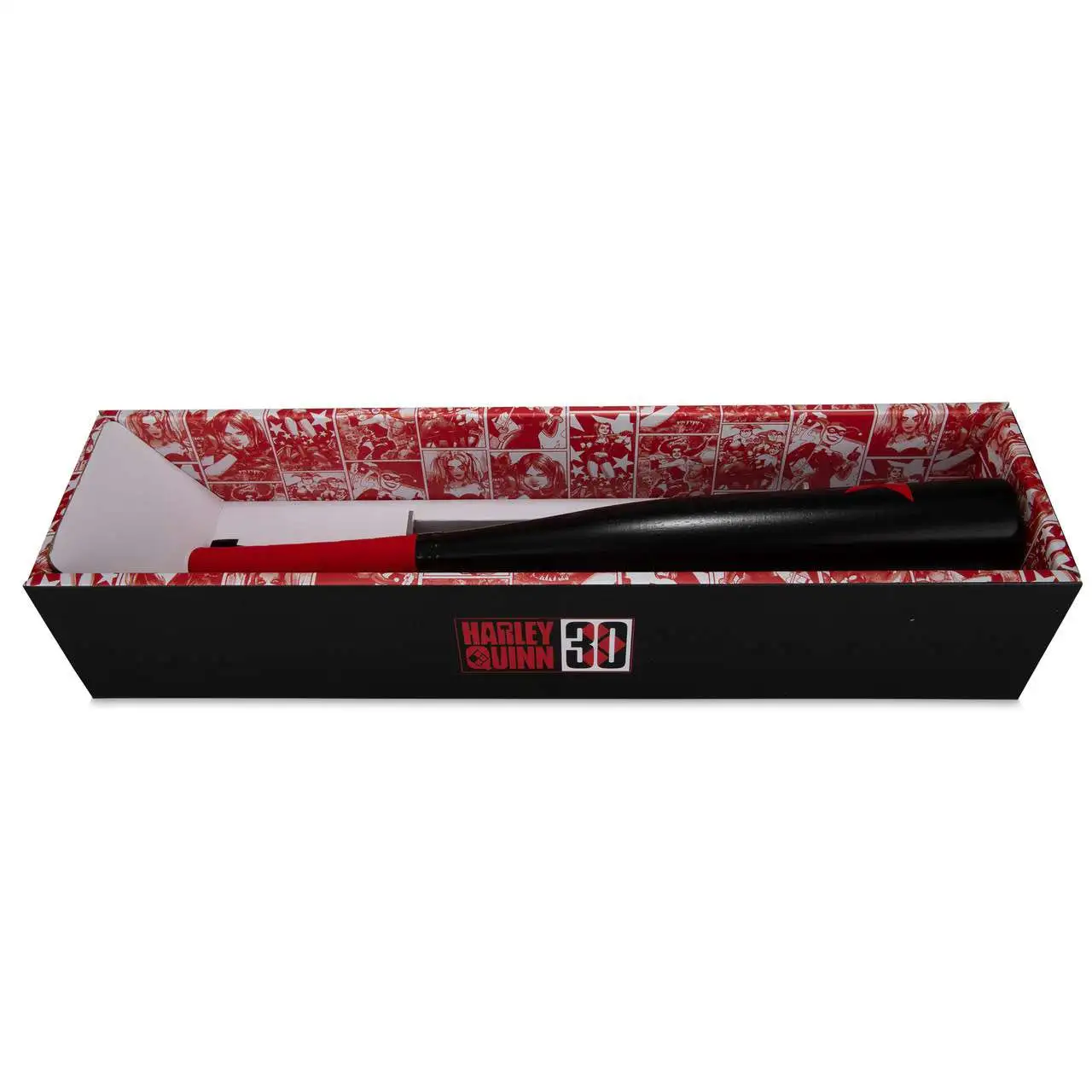 - 1:2 scale replica wood Harley Quinn bat Designed in celebration of Harley Quinn's 30th Anniversary Bat includes clear display base to showcase item Showcased in Harley Quinn 30th anniversary packaging.
