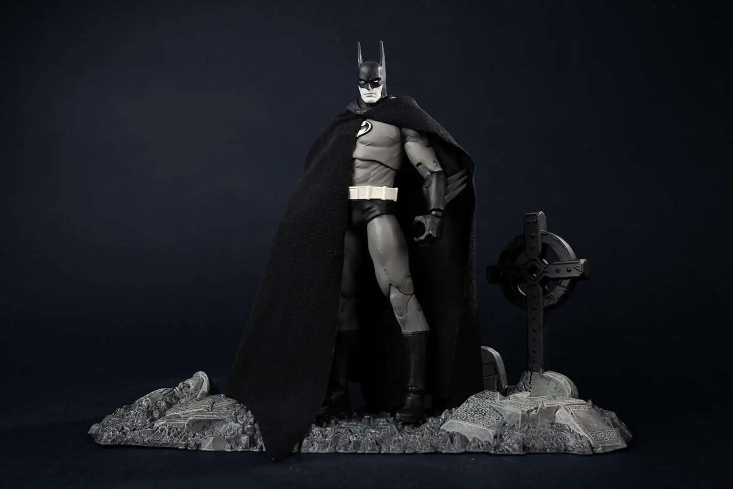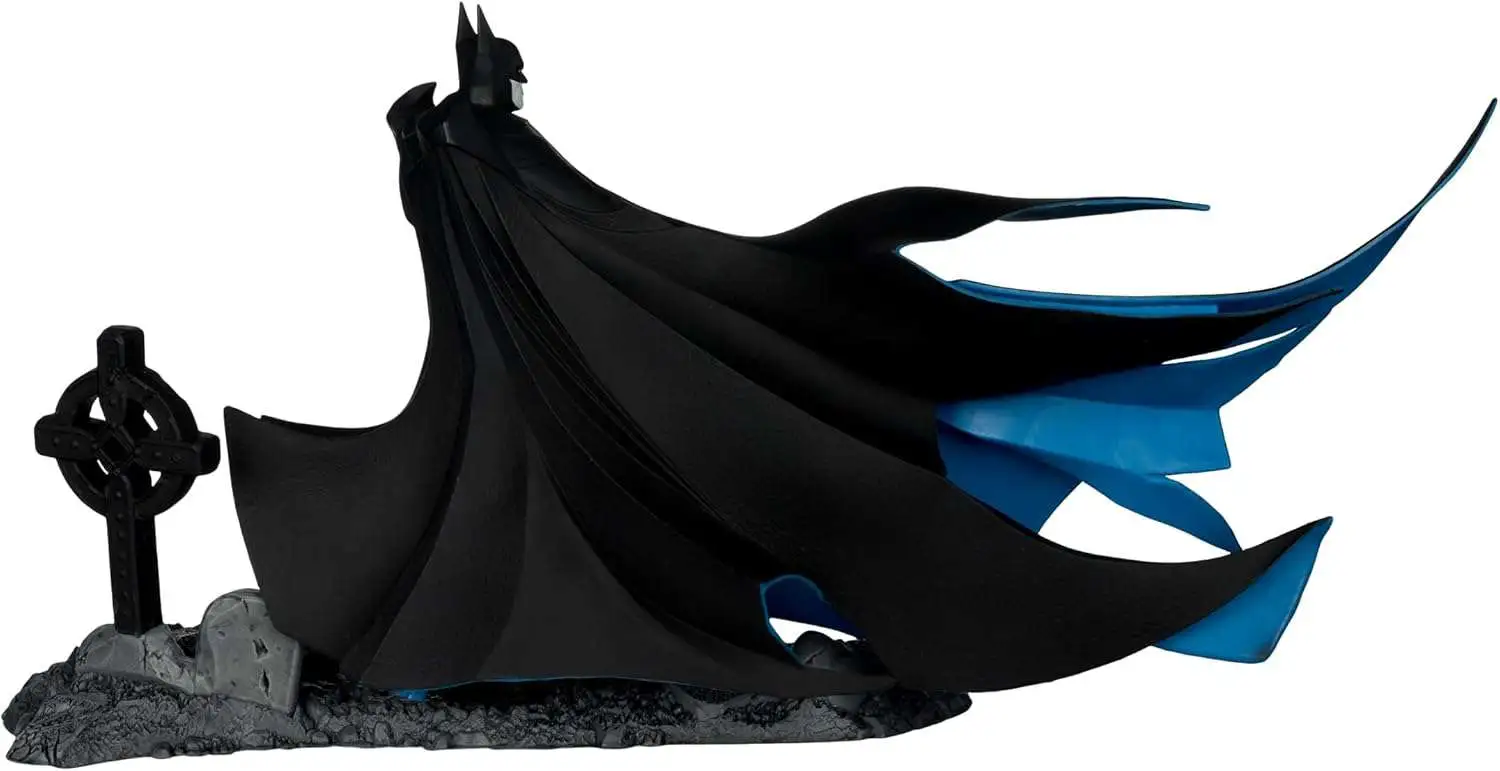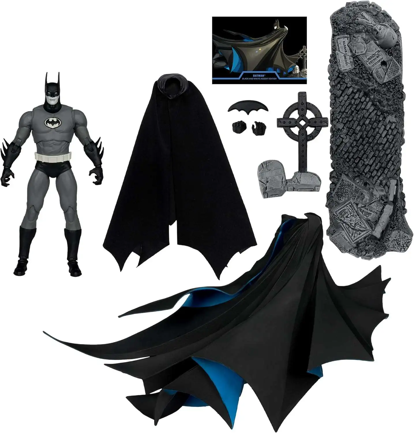 - Batman includes, a large stylized cape, a fabric cape, a batarang, 2 alternate hands and a cemetery base