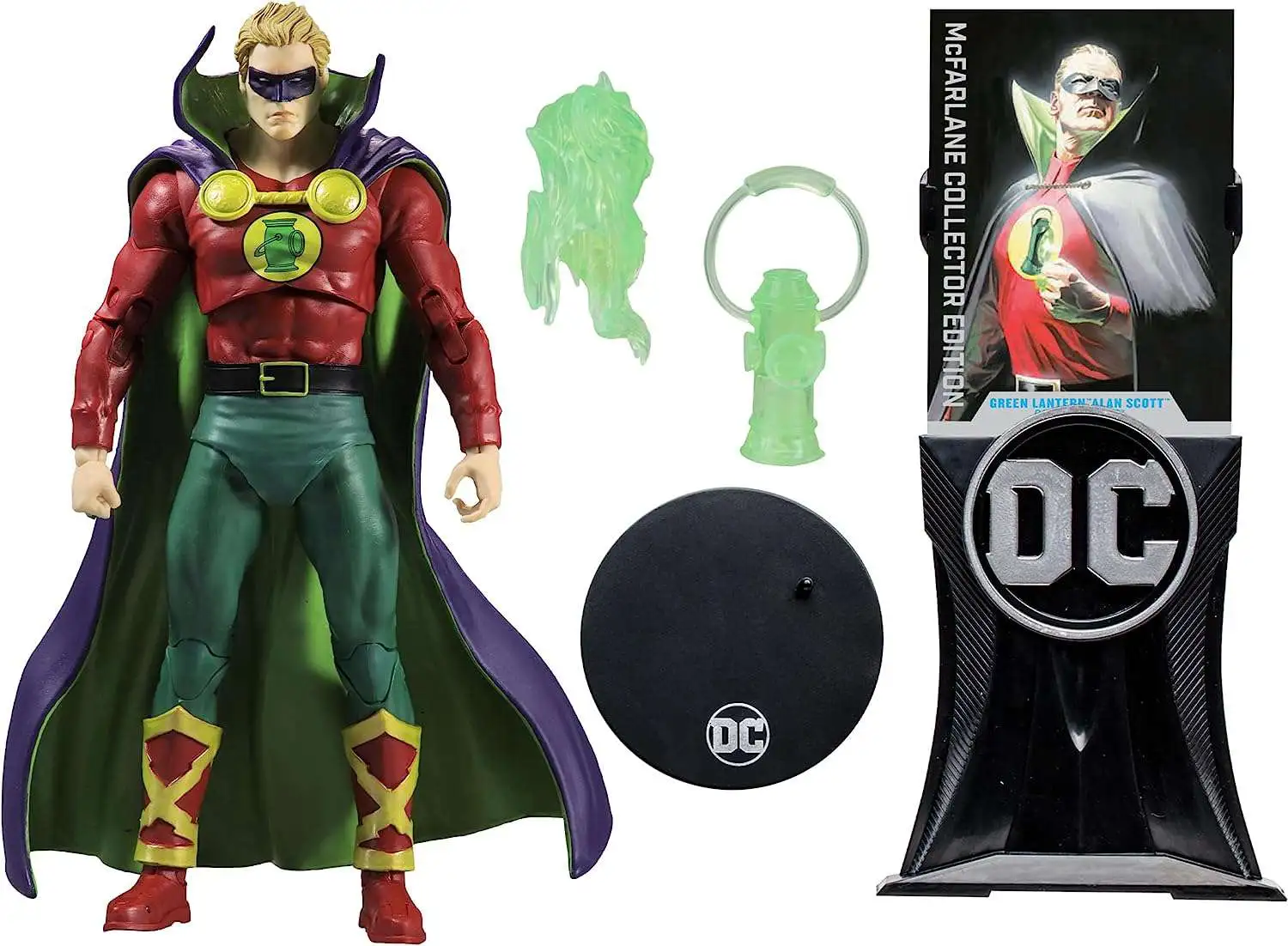 - Green Lantern Alan Scott includes a lantern, attachable flame accessory, exclusive card stand and base.
