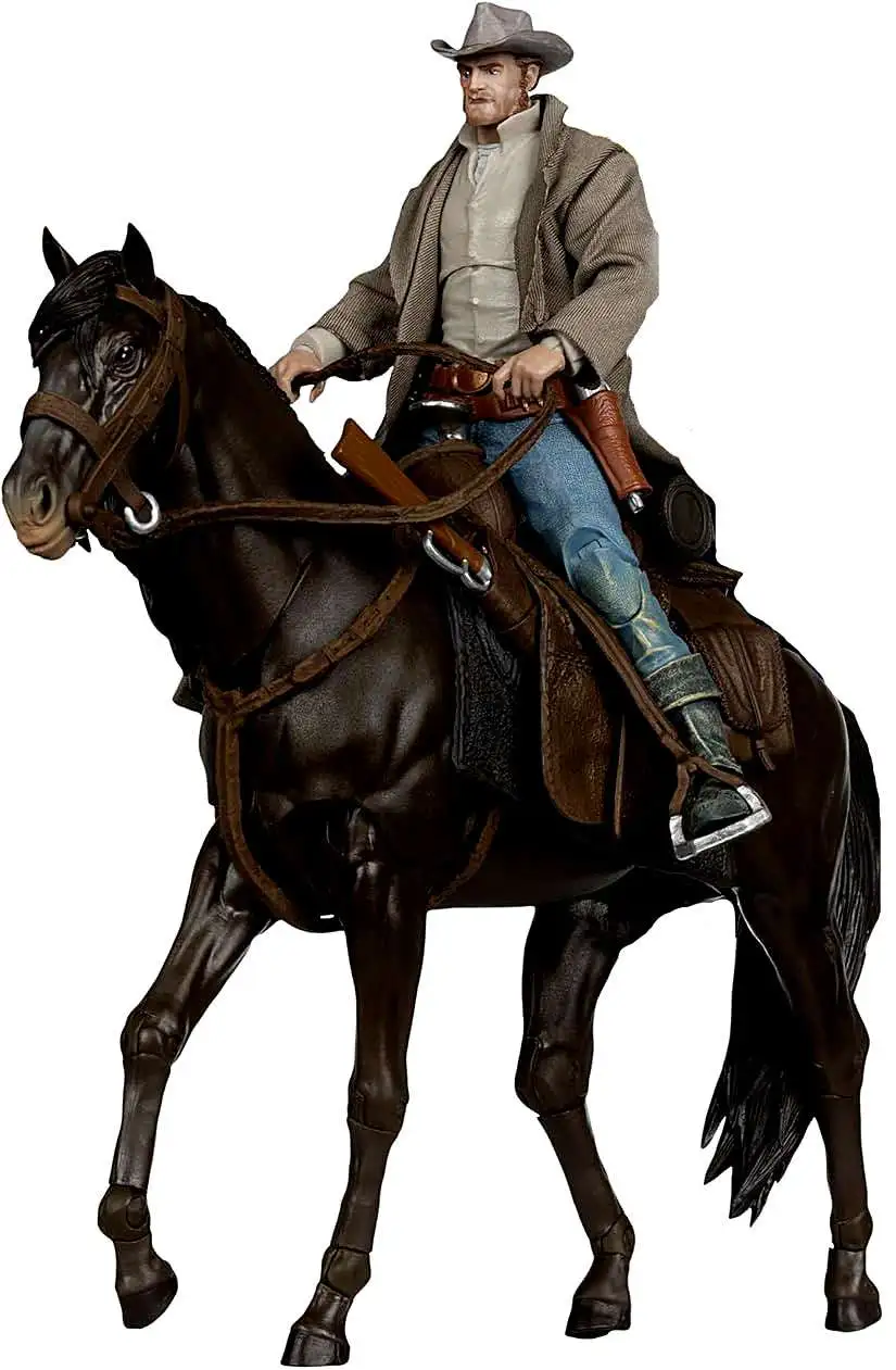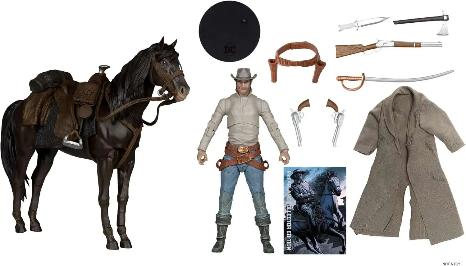 Accessories include tomahawk, rifle, 2 revolvers, knife, sword, 2 interchangeable belts with holsters and figure base.