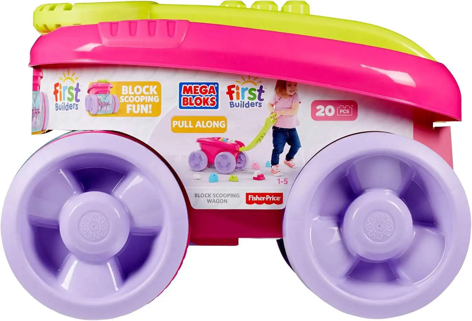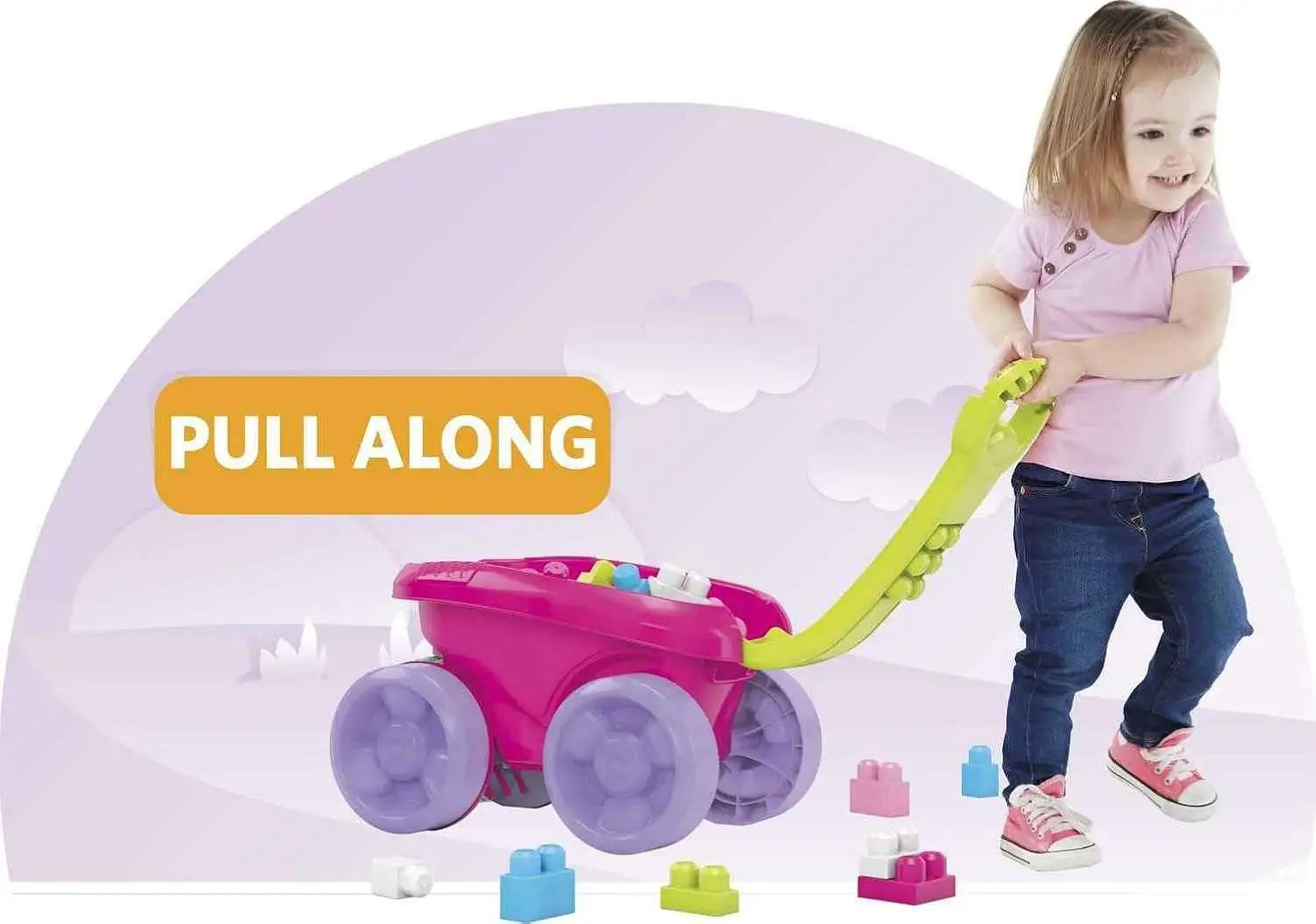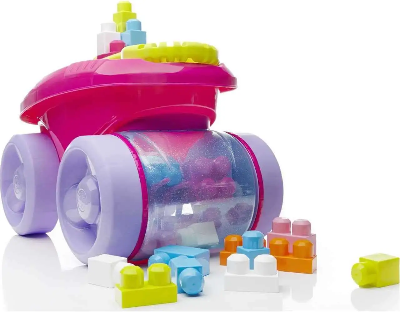 - Building set comes with 1 colorful pull wagon that rolls over blocks to pick them up