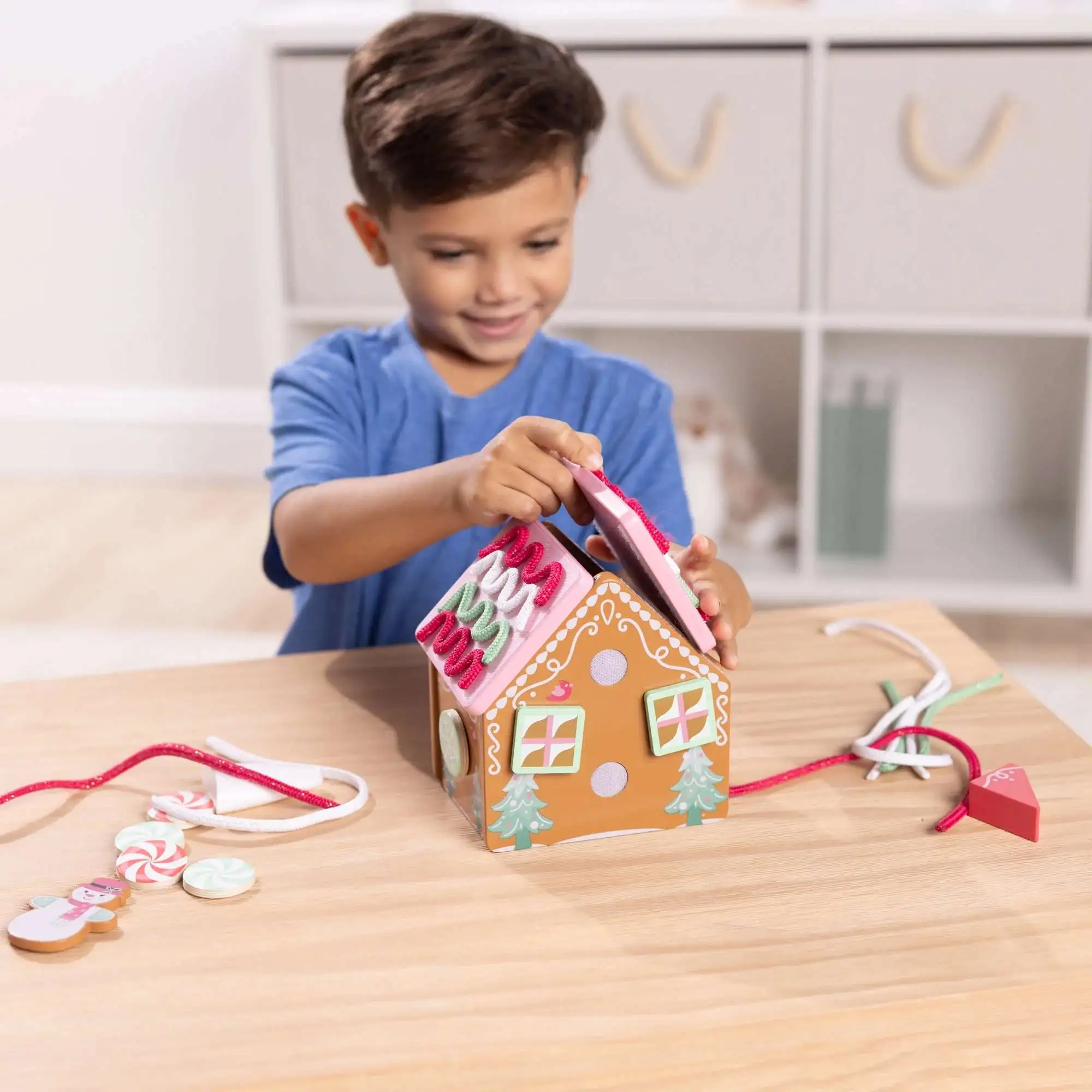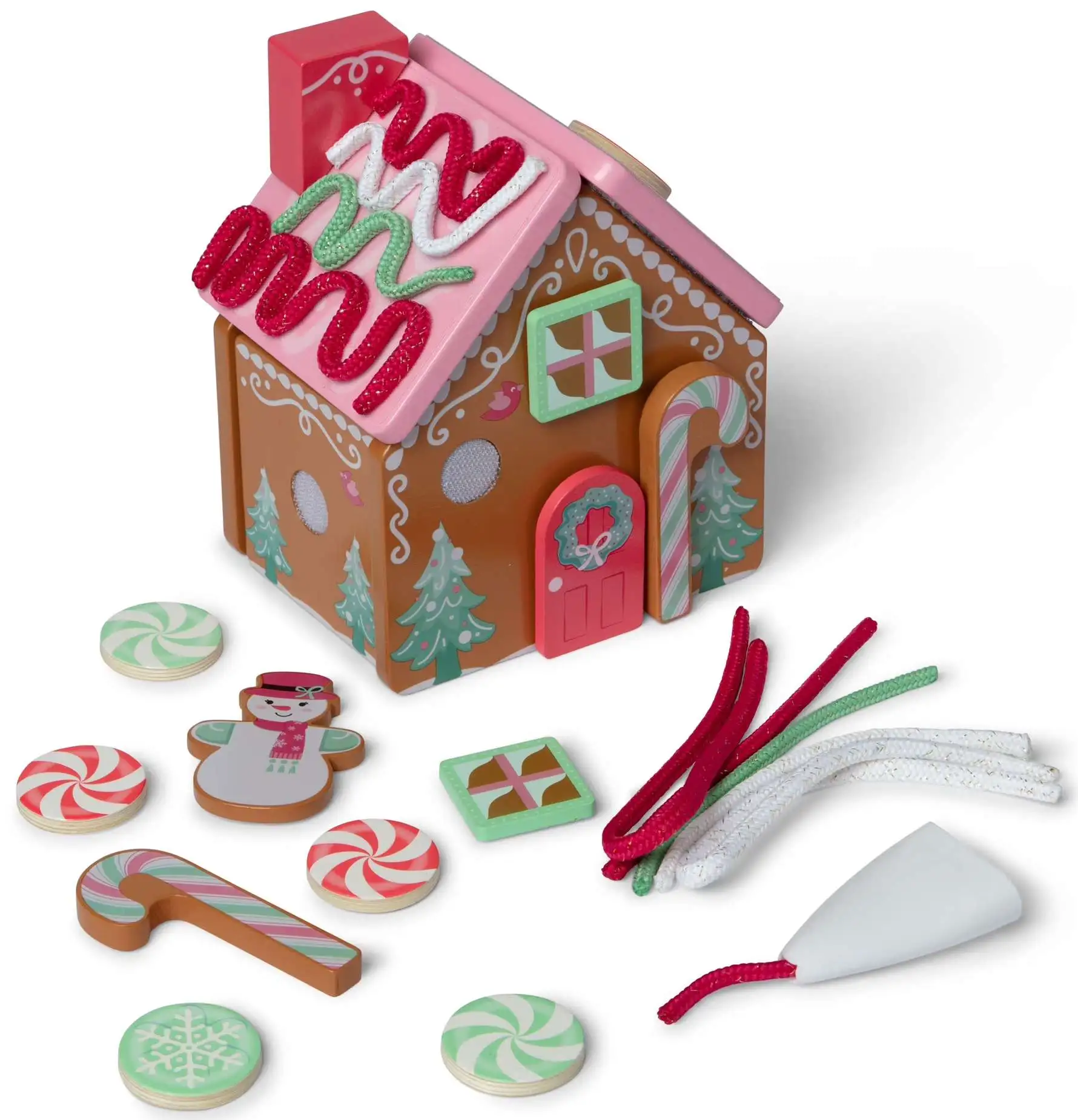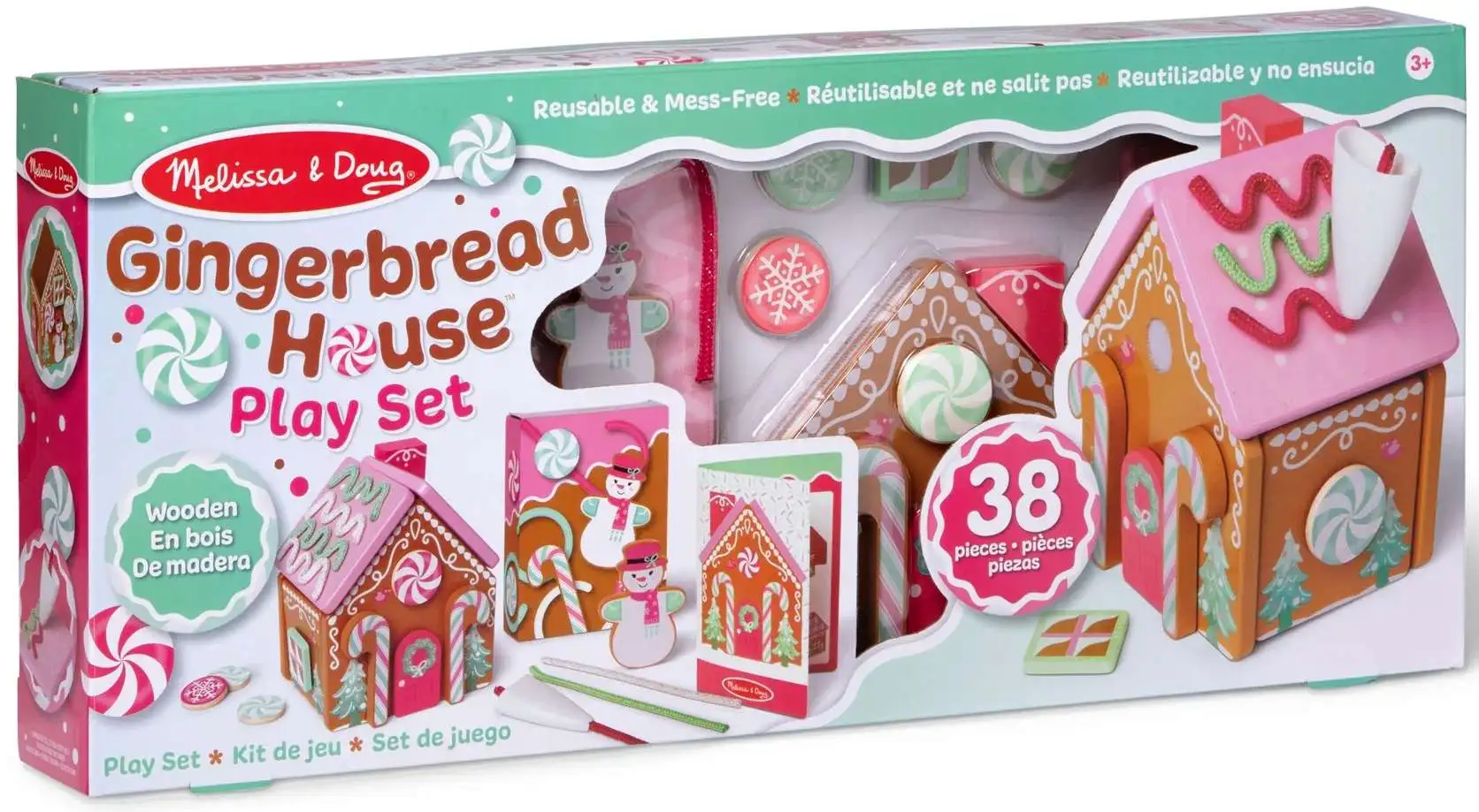- Features a re-buildable wooden gingerbread house for festive pretend play, allowing for repeated decoration and assembly.