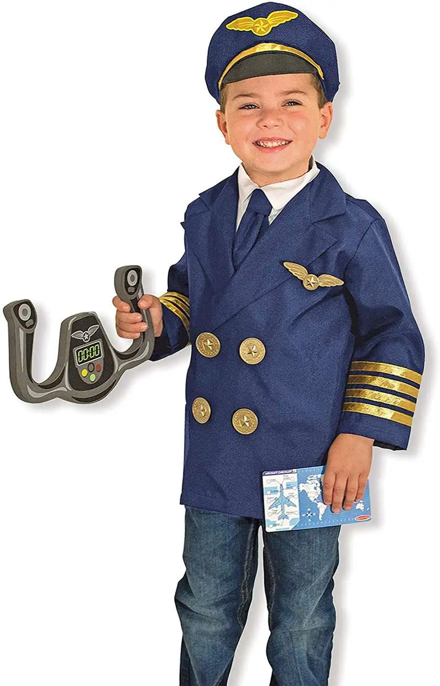 - Includes uniform jacket with shirtfront, hat, detachable necktie, flight wings, reusable activity card, and steering yoke.