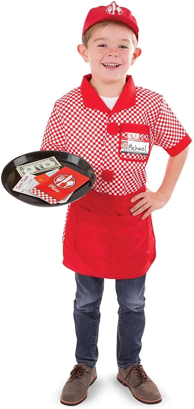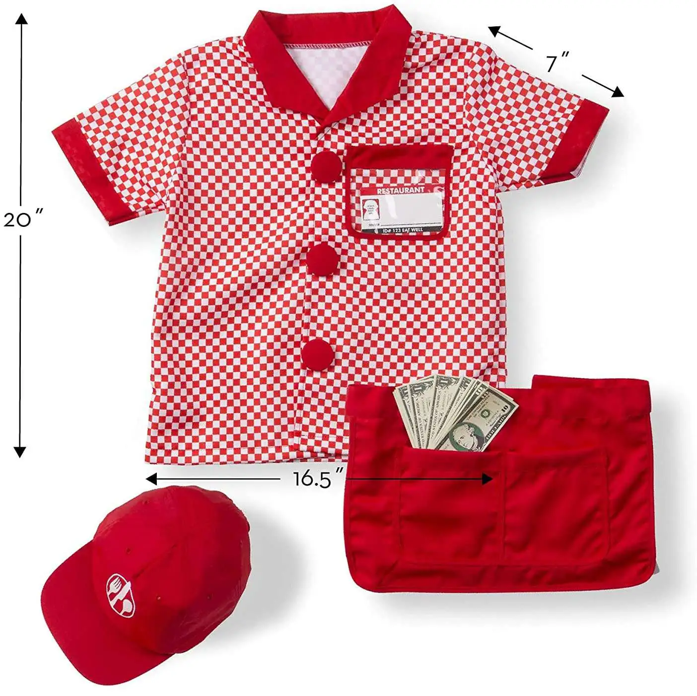 - Includes shirt, half apron, cap, name tag for pencil personalization, tray, menu, write-on guest check, play money and credit card