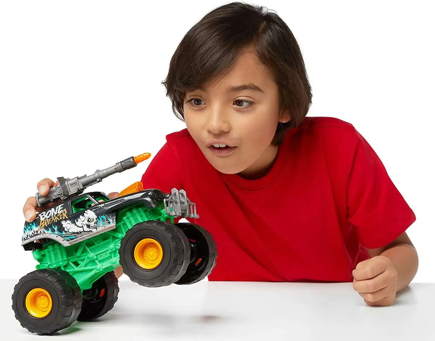 - TOY FIRING WEAPON: Destroy your opponents with a roof top firing weapon. Shoot down the competition before finishing them off with an epic Monster Truck crash!