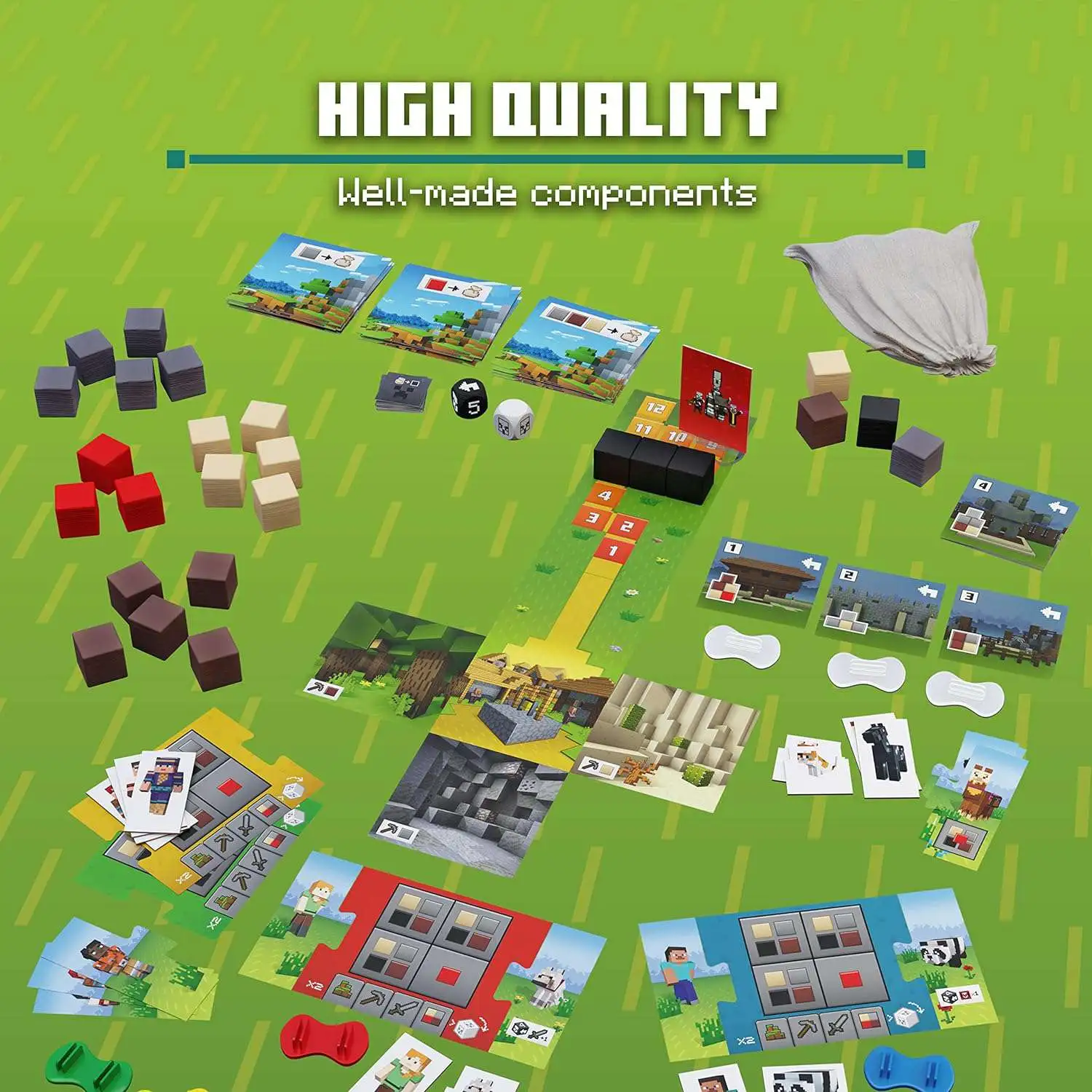 In Minecraft: Heroes of the Village, the players will work together to defend the village from an impending illager raid. On your turn you will have 2 actions to spend on exploring the world, collecting blocks, fighting mobs, and building. At the end of your turn, roll the die to see if the illagers advance towards the village. As the illagers get closer to the village, more monsters will spawn, but dont worry! You have your faithful pets to help. Each pet has a special ability that can help you succeed. If you manage to construct three buildings before the illagers reach the village, you win!