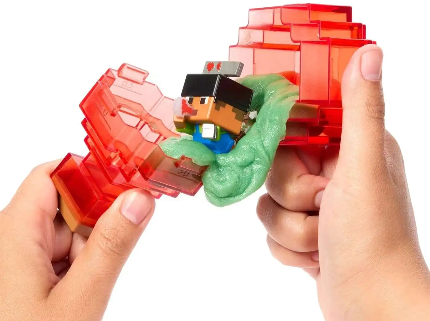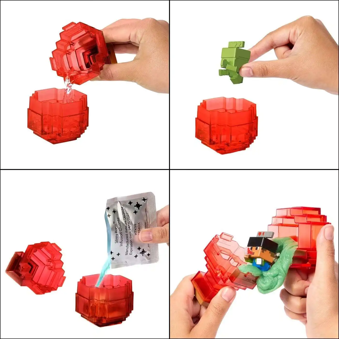 - Open reusable potion containers to reveal a mini Minecraft figure and slime brew particles.