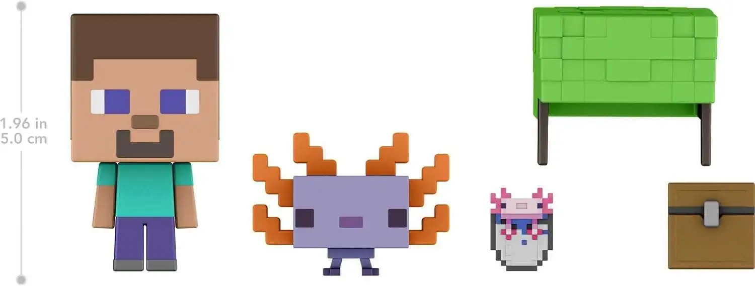 - The re-designed Minecraft Mob Head Mini Steve and Axolotl figures are styled with giant heads