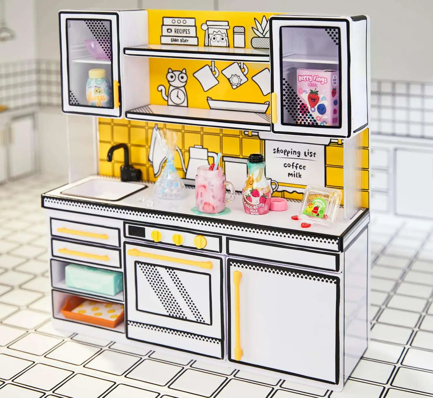 UNBOX IT: Each Mini Kitchen playset comes with realistic mini "ingredients" and kitchen accessories to make your own mini replicas of your favorite snacks and desserts. Playset includes an oven, refrigerator, countertop, and shelves. Comes with 2 Bonus Recipes, mystery ingredients, plus 2 Exclusive mini oven mitts that can only be found with this Mini Kitchen playset.