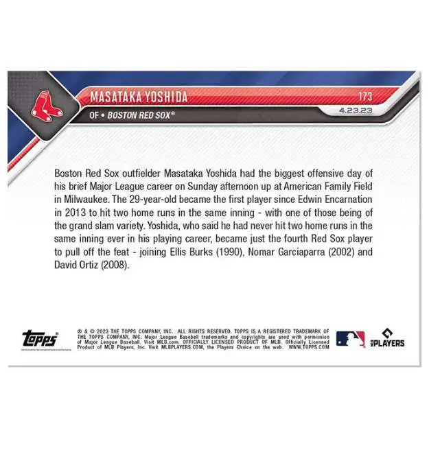 MLB Boston Red Sox 2023 NOW Baseball Masataka Yoshida Exclusive #173 [Rookie, 1st Since 2103 with a HR & Grand Slam In The Same Inning!]