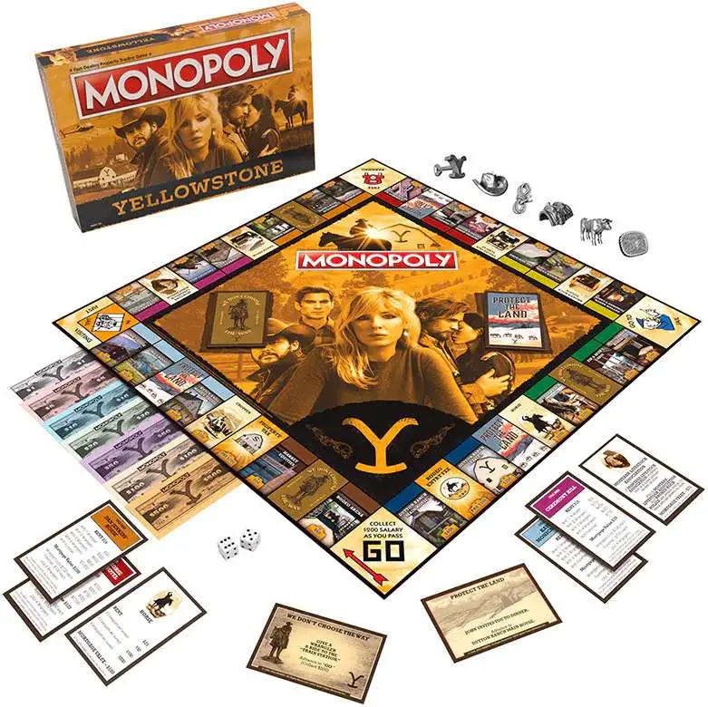 - Contains: Game Board, 6 Collectible Tokens, 28 Title Deed Cards, 16 WE DON'T CHOOSE THE WAY Cards, 16 PROTECT THE LAND Cards, 32 Houses, 12 Hotels, 1 Pack of custom Yellowstone Currency, 2 Dice, Rules.