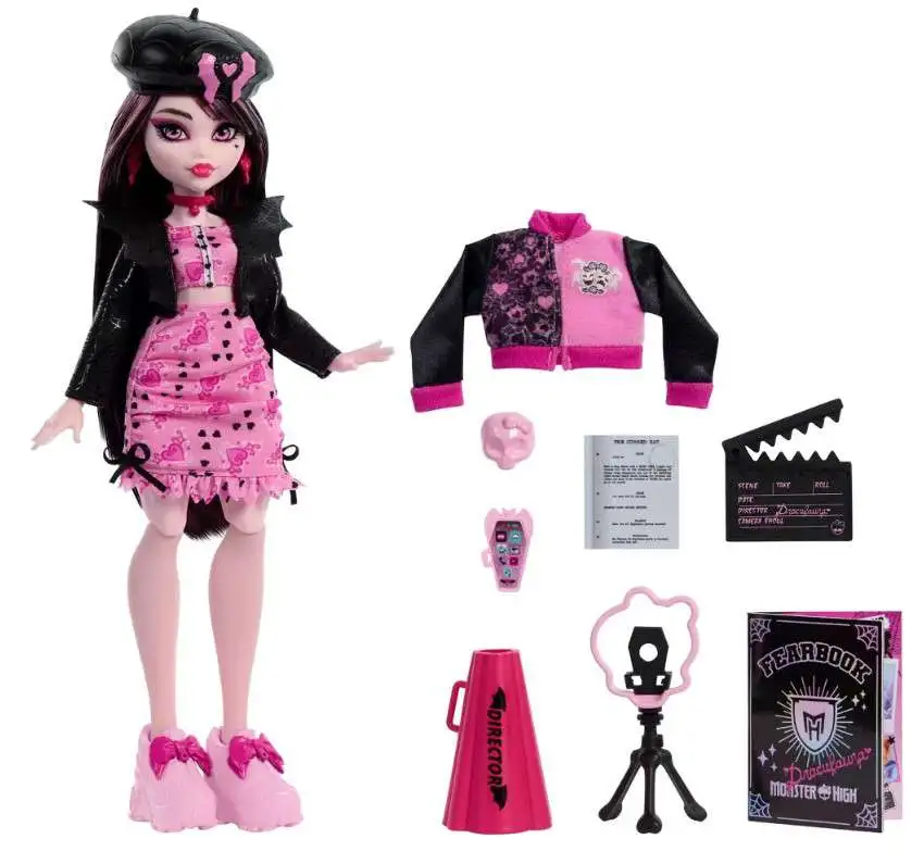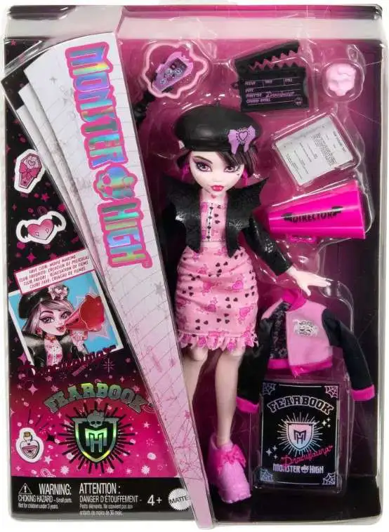 - Draculaura doll is ready for her close-up in the Monster High Fearbook! She comes with a yearbook and 6 movie-themed accessories to make cinematic screams come true.