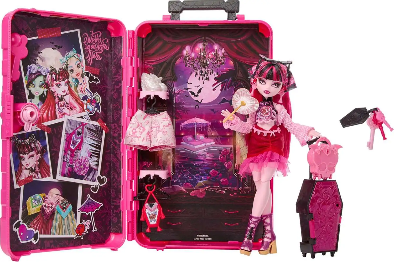 - Inside the luggage case lurks a vampire and 19 surprises... Step one? Use the key hidden in the front of the case to open the door and reveal Draculaura doll in a fangtastic resort outfit!