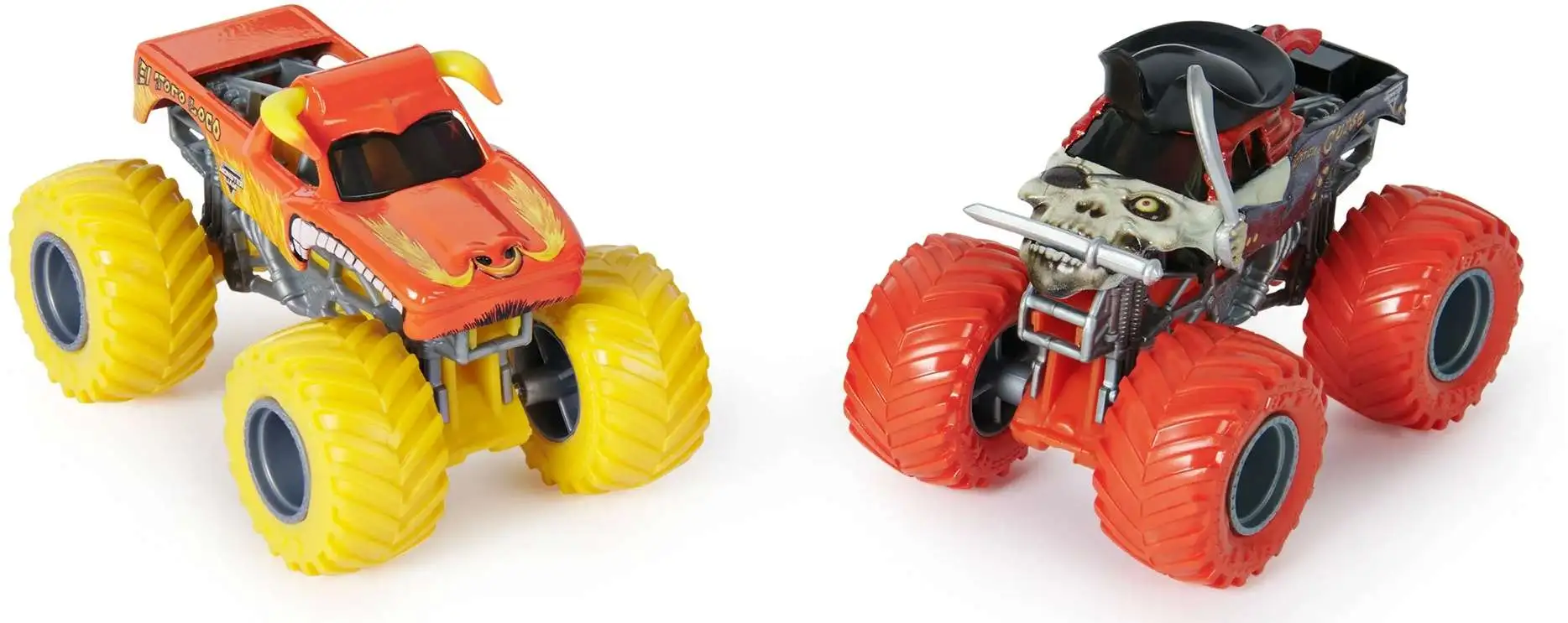 - HEAD-TO-HEAD ACTION: Put on an awesome Monster Jam show with the 2-Pack! Each set comes with 2 iconic Monster Jam monster trucks, including El Toro Loco Vs. Pirate's Curse, Shaker Vs. Soldier Fortune and more!