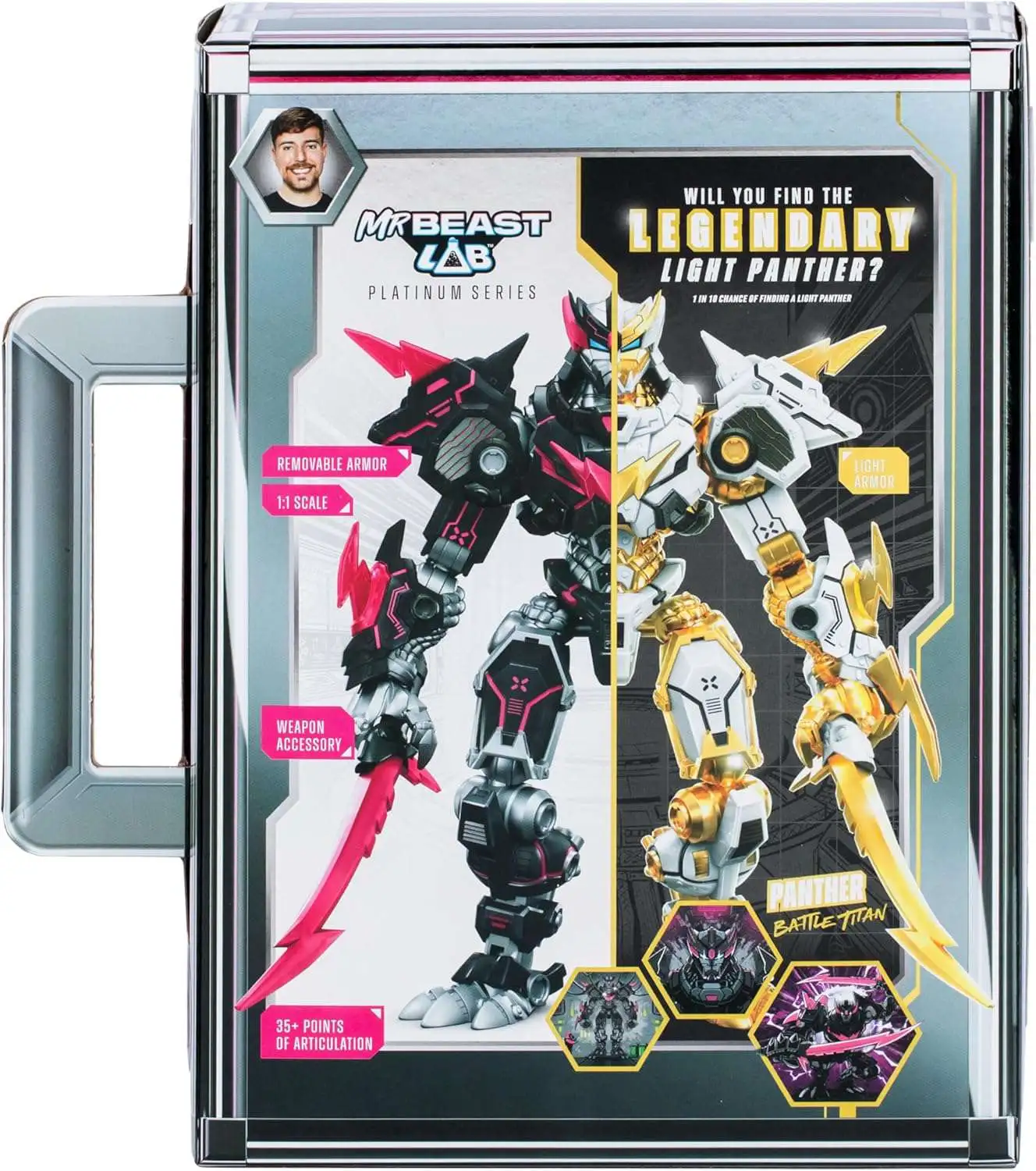 - The MrBeast Lab Platinum Series: Lift off the iconic MrBeast briefcase sleeve to reveal the Stealth Panther Battle Titan Collector Figure.