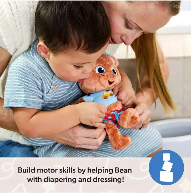 - MODEL POTTY TIME: Teach littles as they help Bean change his diaper, wipe with play toilet paper, & use felt accessories like a banana, sippy cup & soap as they learn about daily routines through play.