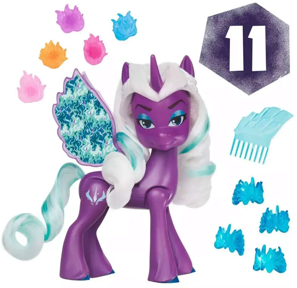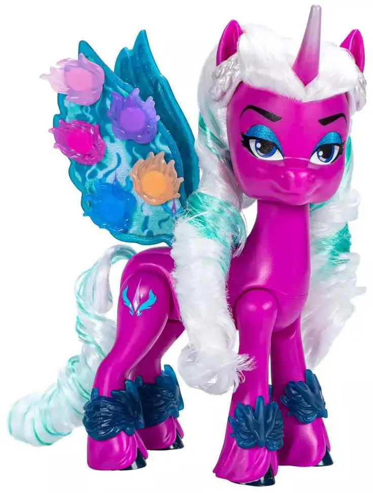 Connect the colorful charms to Opaline's beautiful wings to imagine she's growing her Fire Alicorn magic! Then, squeeze the figure's back legs to make her wings flap up and down. Comes with 10 accessories for styling and storytelling. Customize her look with 4 show-inspired gauntlet bracelets that connect to her legs. This My Little Pony doll is a 5-inch purple Alicorn figure with an Alicorn Cutie Mark on one side. Figure has soft, long white hair and a comb for styling fun!