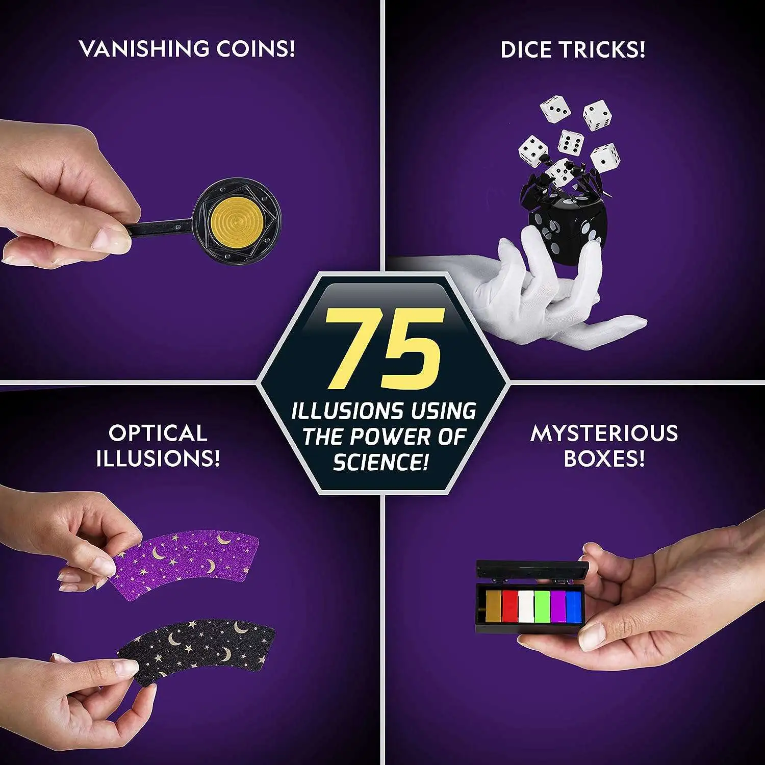 With this magic kit, kids will be able to: Make coins, balls, and cards disappear and reappear; levitate a squiggly worm; make a card balance on the back of their hand; turn a dollar bill into a handkerchief; turn a handkerchief back into a dollar bill; amaze audiences with optical illusions; perform a wide variety of sleight-of-hand card tricks; magically push spikes through a coin; and learn about the fascinating science behind many of the tricks to perform an unforgettable magic show!