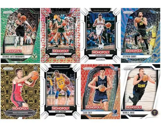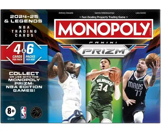 - MONOPOLY PANINI PRIZM 2024-25 AND LEGENDS NBA CARDS: This Monopoly Panini Prizm: 2024-25 & Legends NBA Trading Cards Booster Box includes 24 NBA trading cards, featuring 2024-25 season stars and NBA legends.