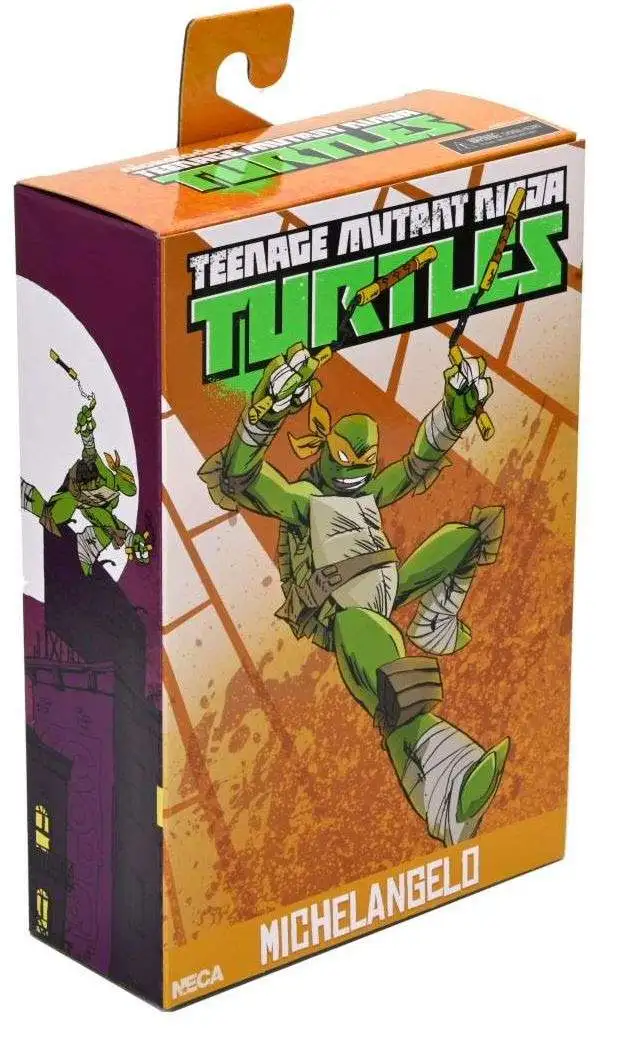 This 7-inch scale Michelangelo figure captures the fun-loving turtle with incredible painted details to replicate his animated appearance. He includes an array of episode-specific accessories: interchangeable heads and hands, nunchucks and kusarigama, pizza slice, smoke bomb, Turtlecom, and fan-favorite Ice Cream Kitty. The figure comes in collector-friendly packaging with illustrations by TMNT artist Ciro Nieli.