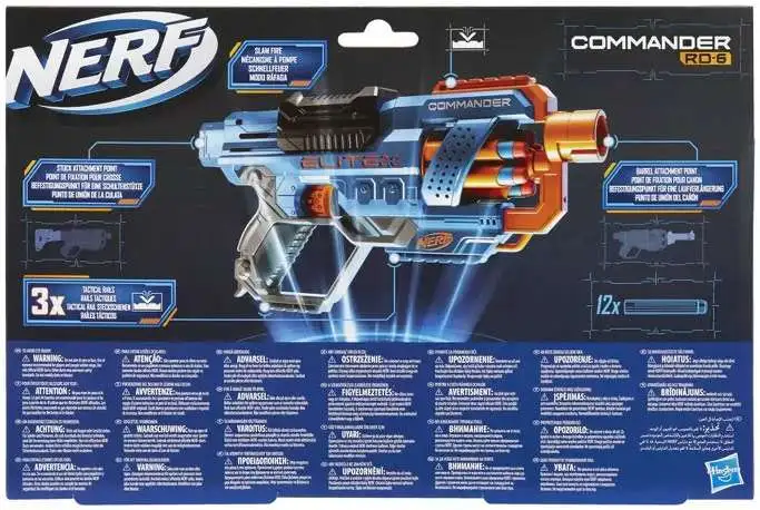- NERF ELITE 2.0 COMMANDER RD-6 BLASTER WITH 6-DART DRUM: This Elite Nerf blaster has a rotating drum with 6-dart capacity. Blast 6 darts in a row with this toy blaster