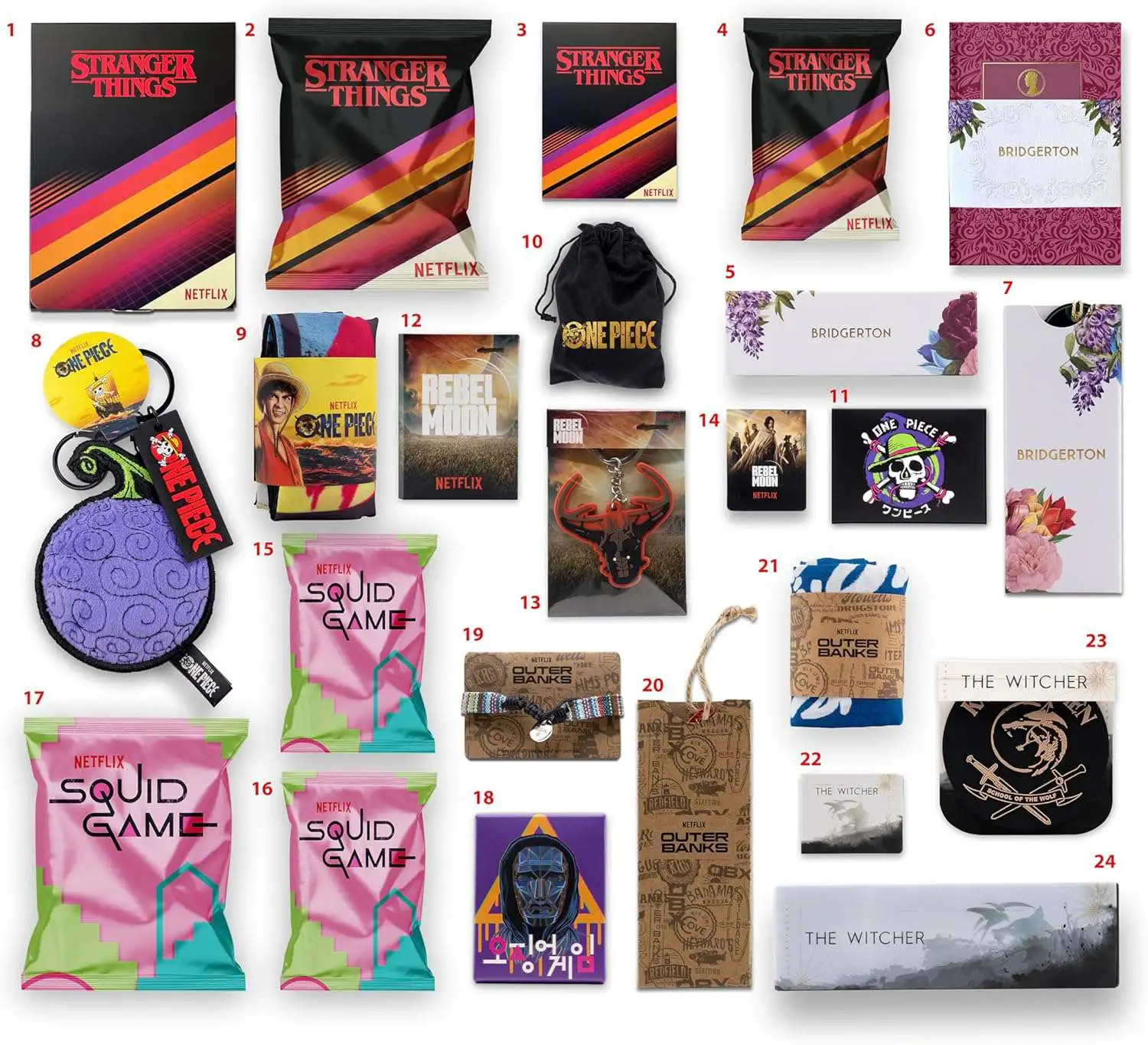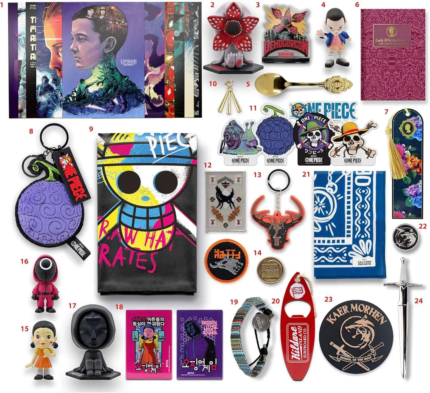 - 7 FAN-FAVORITE NETFLIX TITLES: This surprise gift box features exclusive items from 7 most popular series, including Stranger Things, Squid Game, Bridgerton, The Witcher, One Piece and more. There's something exciting with surprise toys for every kind of action, drama and romance fan.