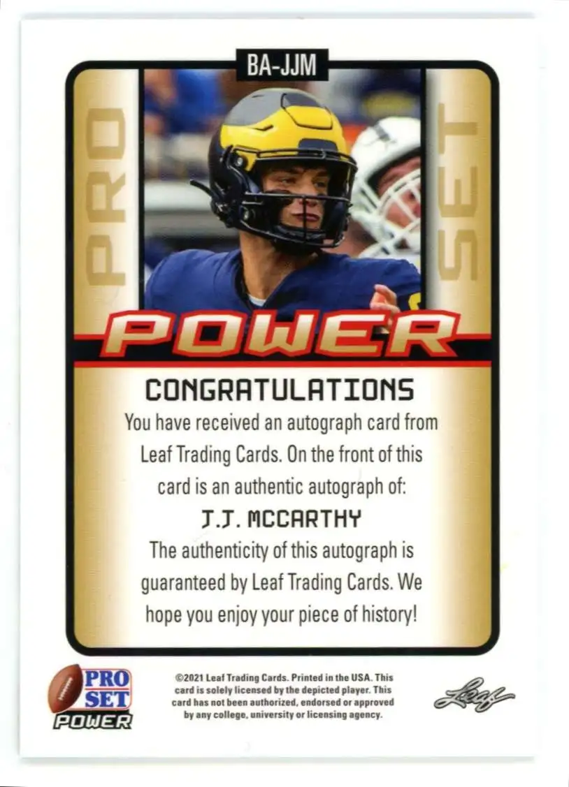 NFL 2021 Leaf Pro Set 68/99 Power J.J. McCarthy BA-JJM [Rookie Auto]