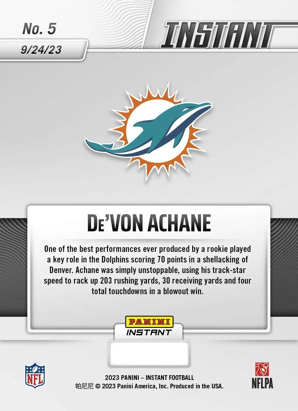 NFL Miami Dolphins 2023 Panini Instant Football De'Von Achane #5 [Rookie, Runs Wild in Rout of Broncos] has successfully been added to your cart!