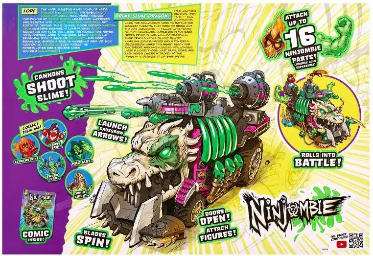 Engineered for mayhem, this battle-ready vehicle comes fully loaded with refillable slime tanks and powerful slime-blasting cannons that unleash Prime Slime ooze in every direction. Big rolling wheels to roll over all kinds of terrain! Built to hold up to 3 Ninjombie figures (sold separately).
