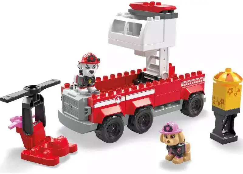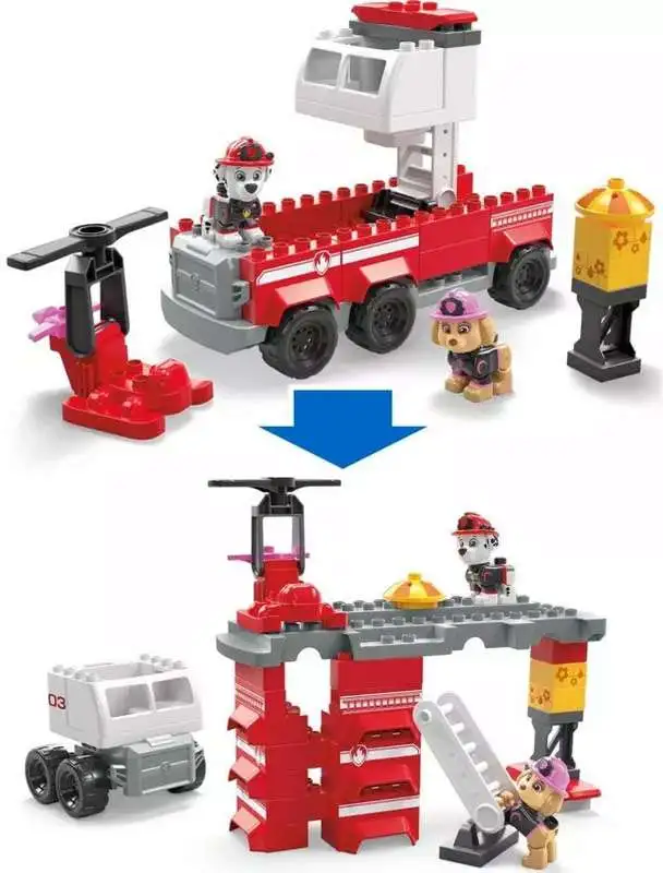 Little builders can head out for a rescue mission with Marshall's Ultimate Fire Truck and 2 poseable figures, Marshall and Skye, inspired by the PAW Patrol series. Kids can build the fire truck with a functional ladder and a front cabin that can be moved. Then, they can build the water tower, release the valve and place Marshall and Skye in their vehicles to save the day. When the mission is complete kids can rebuild the fire truck, transforming it into a rescue station with a garage that fits a small vehicle and a helipad for Skye's helicopter.