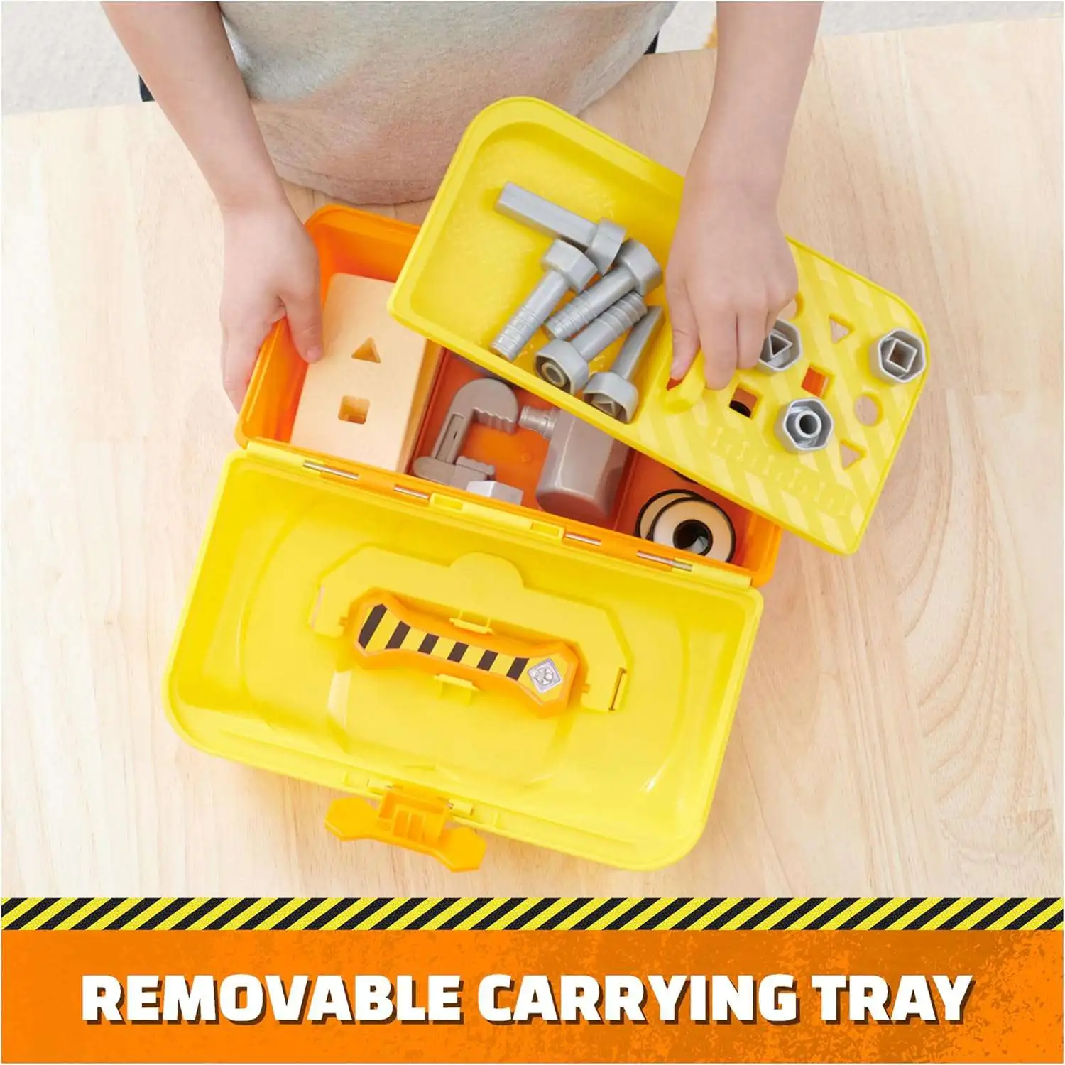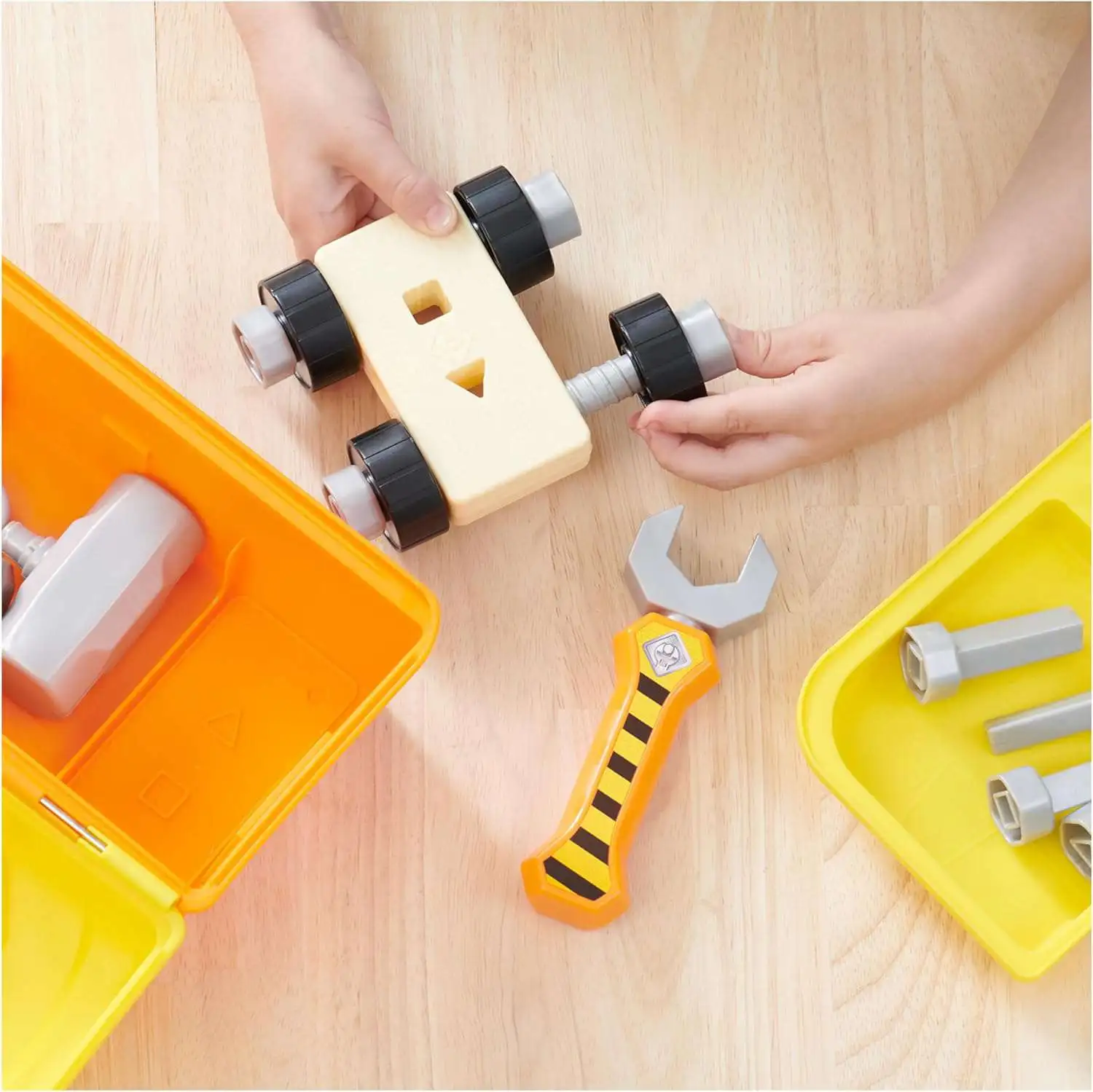 - Includes: 1 Tool Box, 1 Carrying Tray, 1 Tool Handle, 1 Hammer, 1 Screwdriver, 2 Wrenches, 4 Screws, 4 Bolts, 4 Wheels, 1 Sticker Sheet