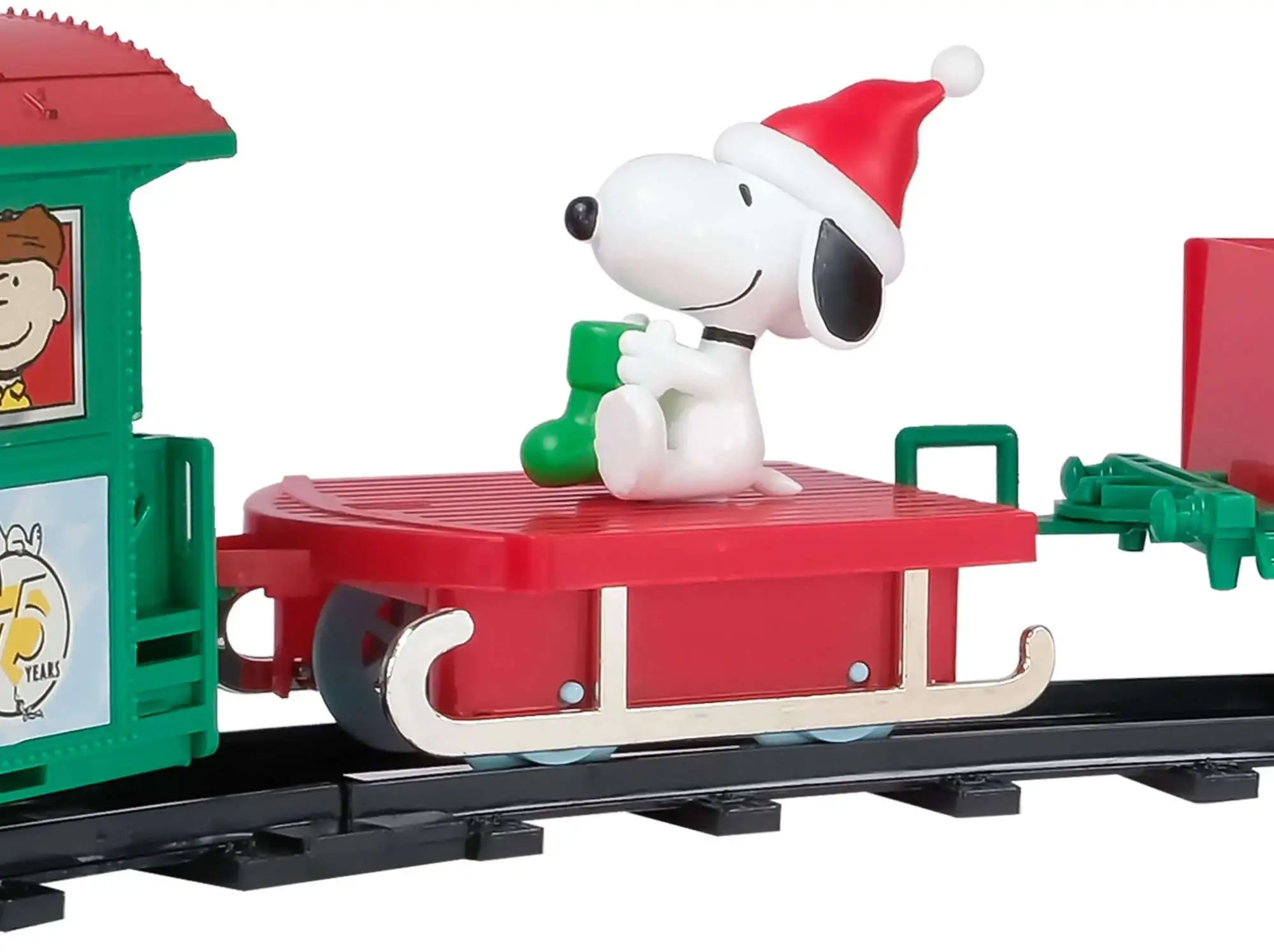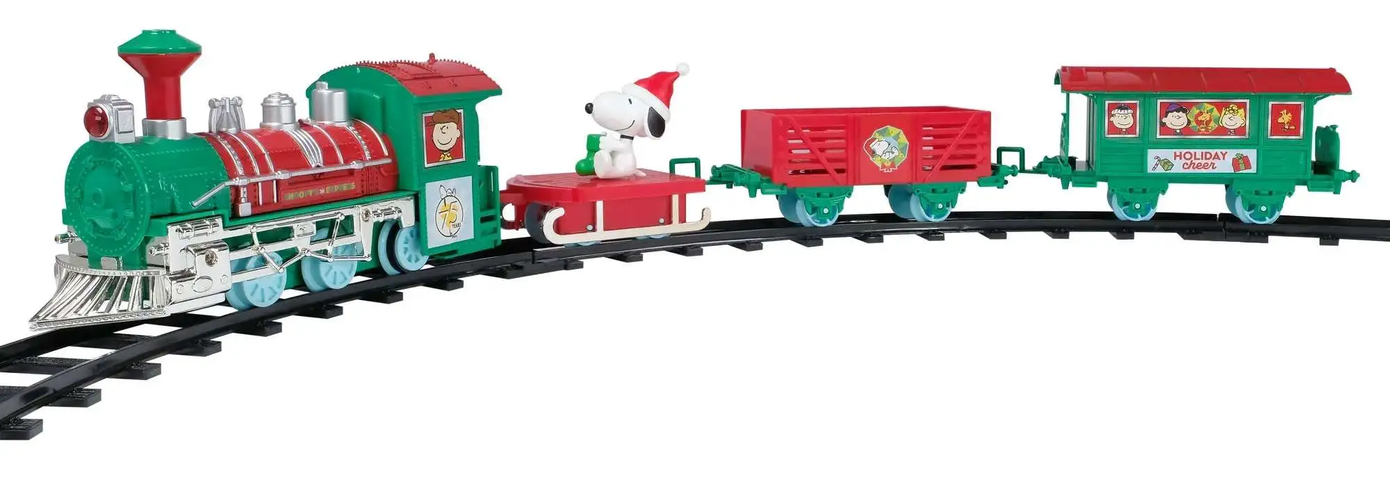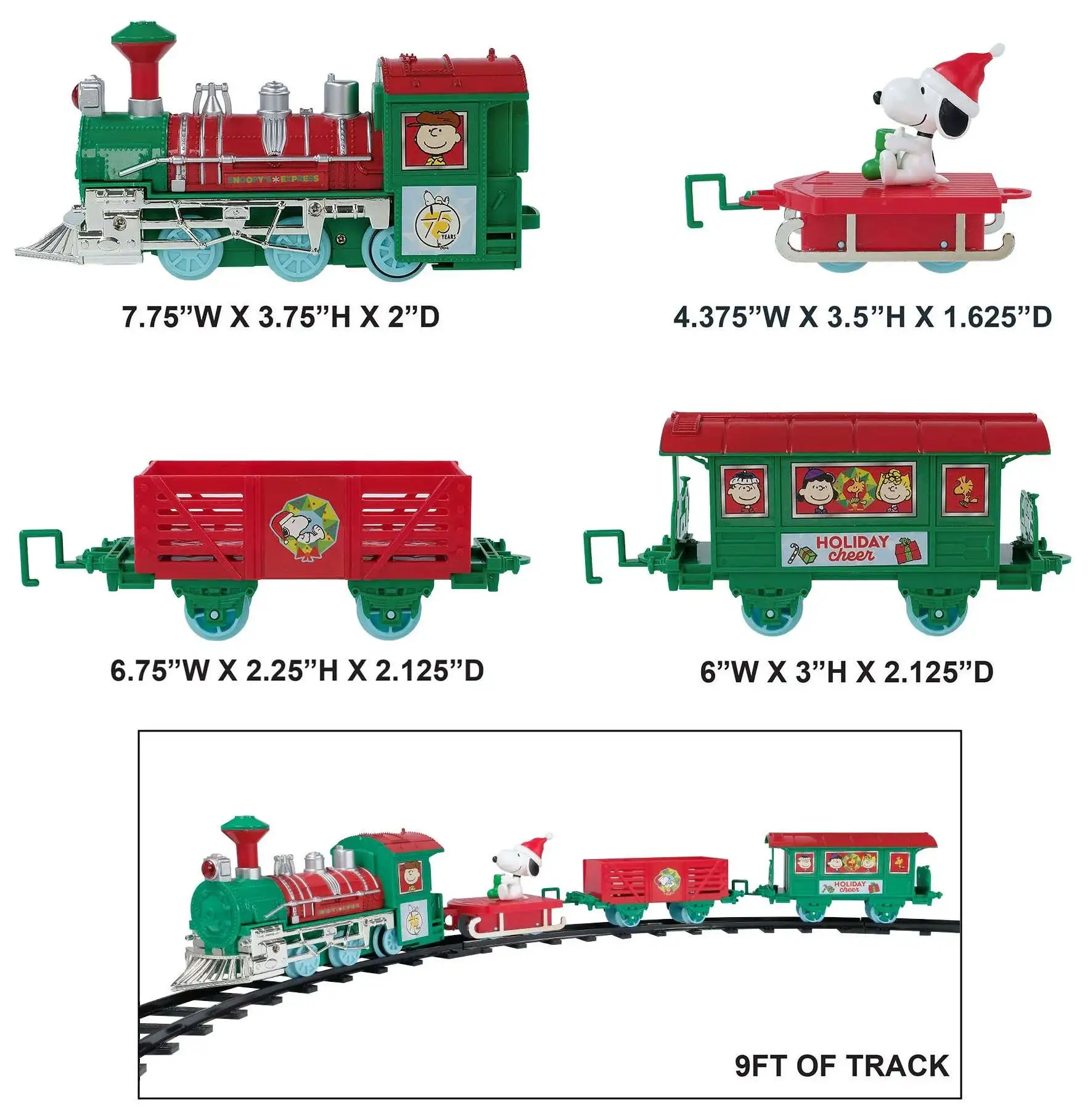 - Brings holiday magic home with Snoopy and friends on an 9-foot, easy-assemble train set featuring lights, cheerful sounds, and a 3-D Snoopy character.