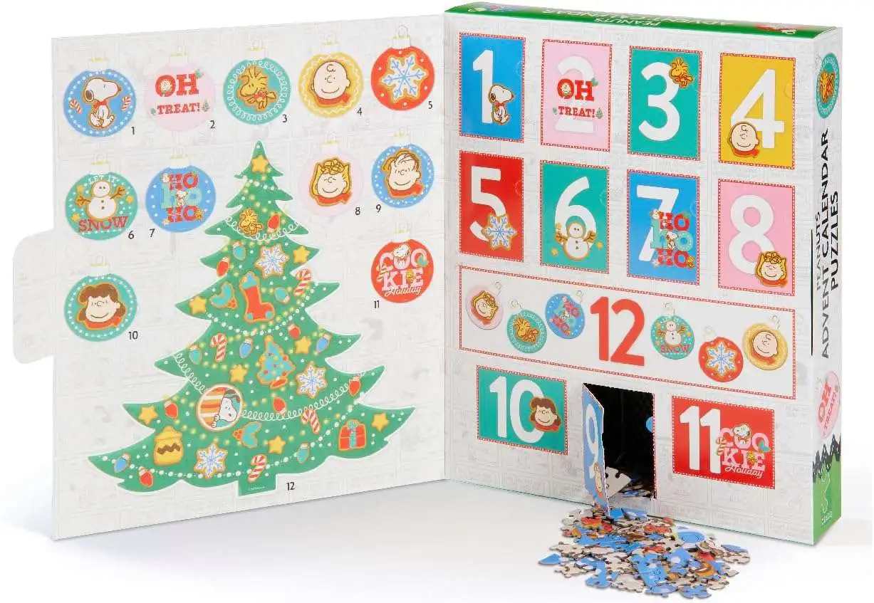 - Peanuts Themed Holiday Countdown/Advent Calendar Puzzles include one 300-piece tree shaped puzzle and eleven 100-piece ornament shaped puzzles.