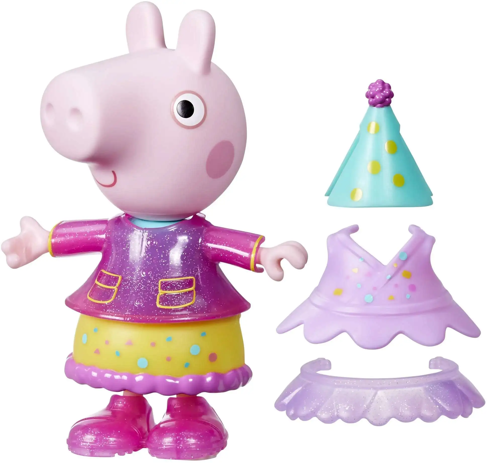 - Dress Peppa up for a birthday party in her confetti top, skirt, and party hat, or for a fancier occasion in her sparkly top, skirt, and shoes. Or mix and match to make sweet and silly combos!