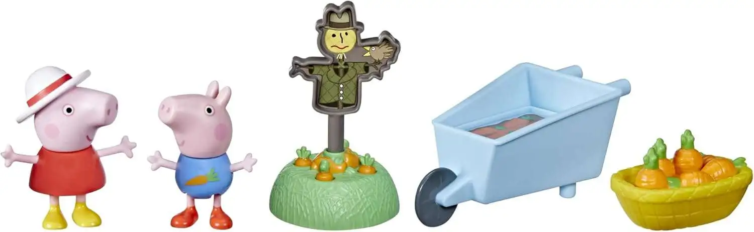 - GARDENING WITH PEPPA AND HER BROTHER GEORGE: Peppa and George love to tend the garden! Toy includes 3-inch Peppa Pig and George Pig figures, plus scarecrow, wheelbarrow, and basket accessories