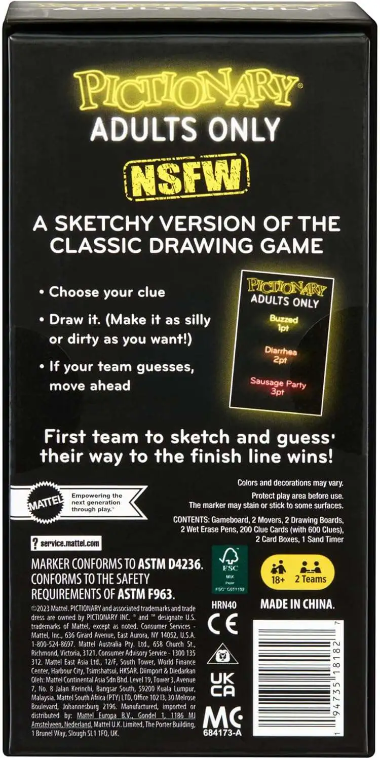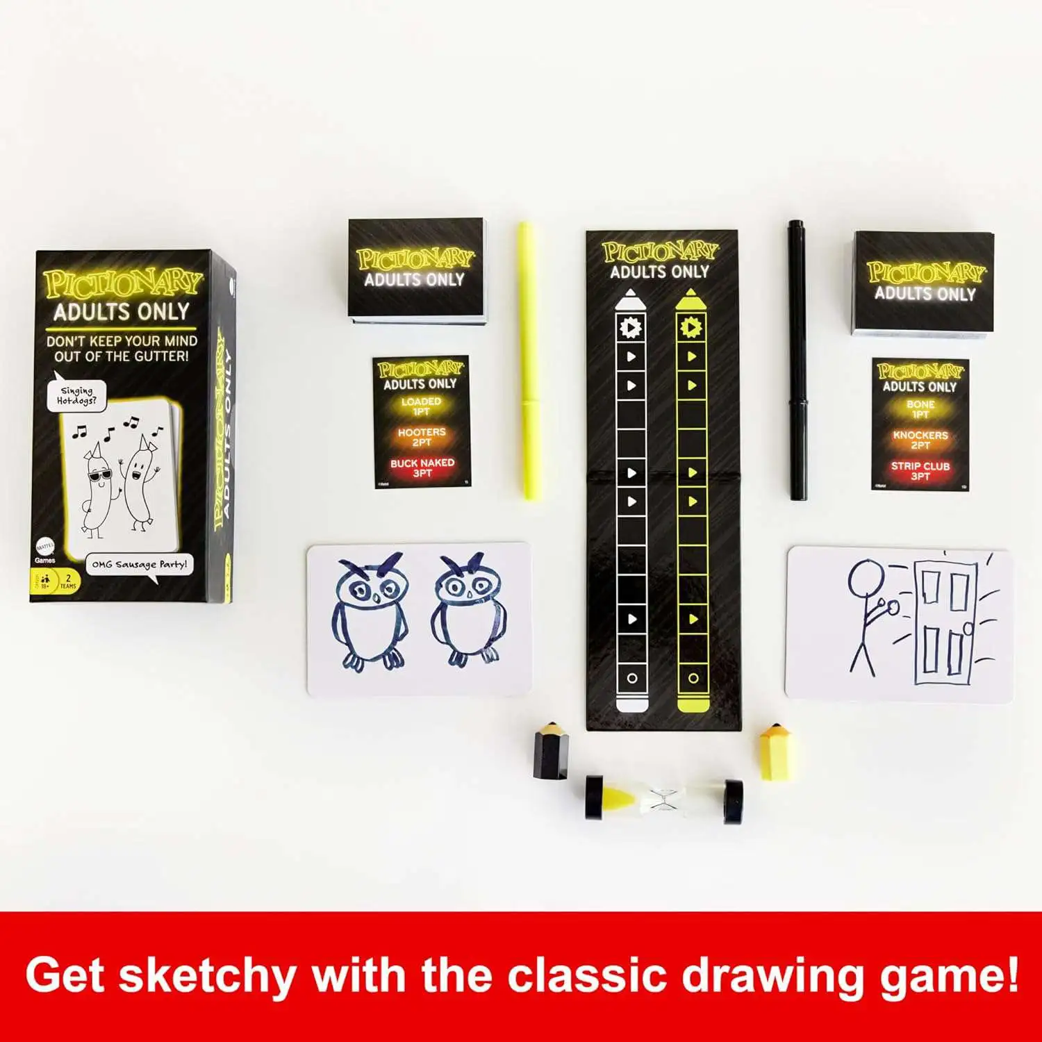 - Pictionary Adults Only game is a hysterically cheeky board game for adults where players draw silly sketches to guess naughty clues.