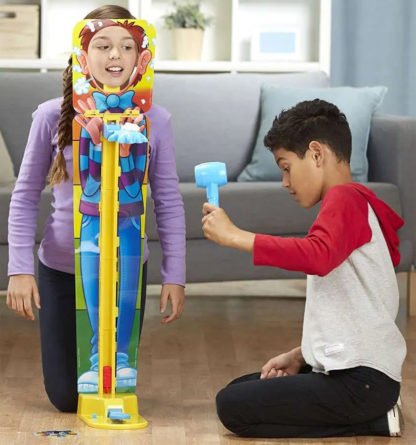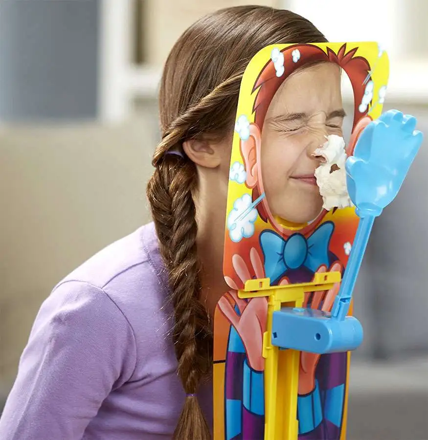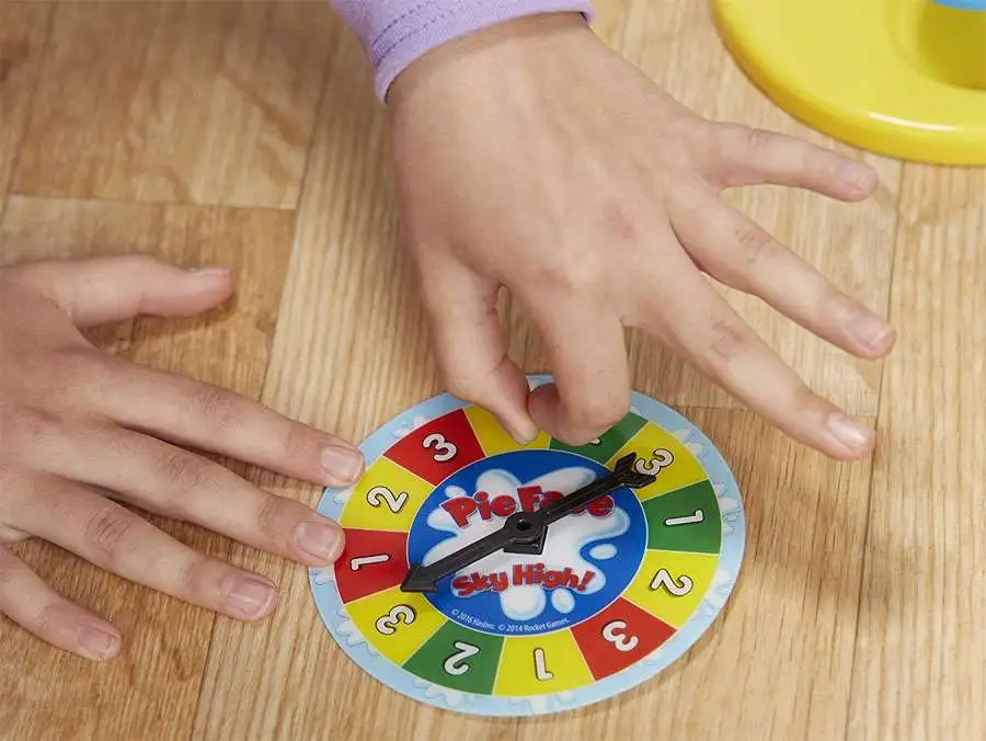 Includes base, 4 track pieces, sliding disk, pie thrower, throwing arm, chin rest, splash-card mask, 2 splash-card panels, plastic hammer, spinner (with arrow and base), and game rules.