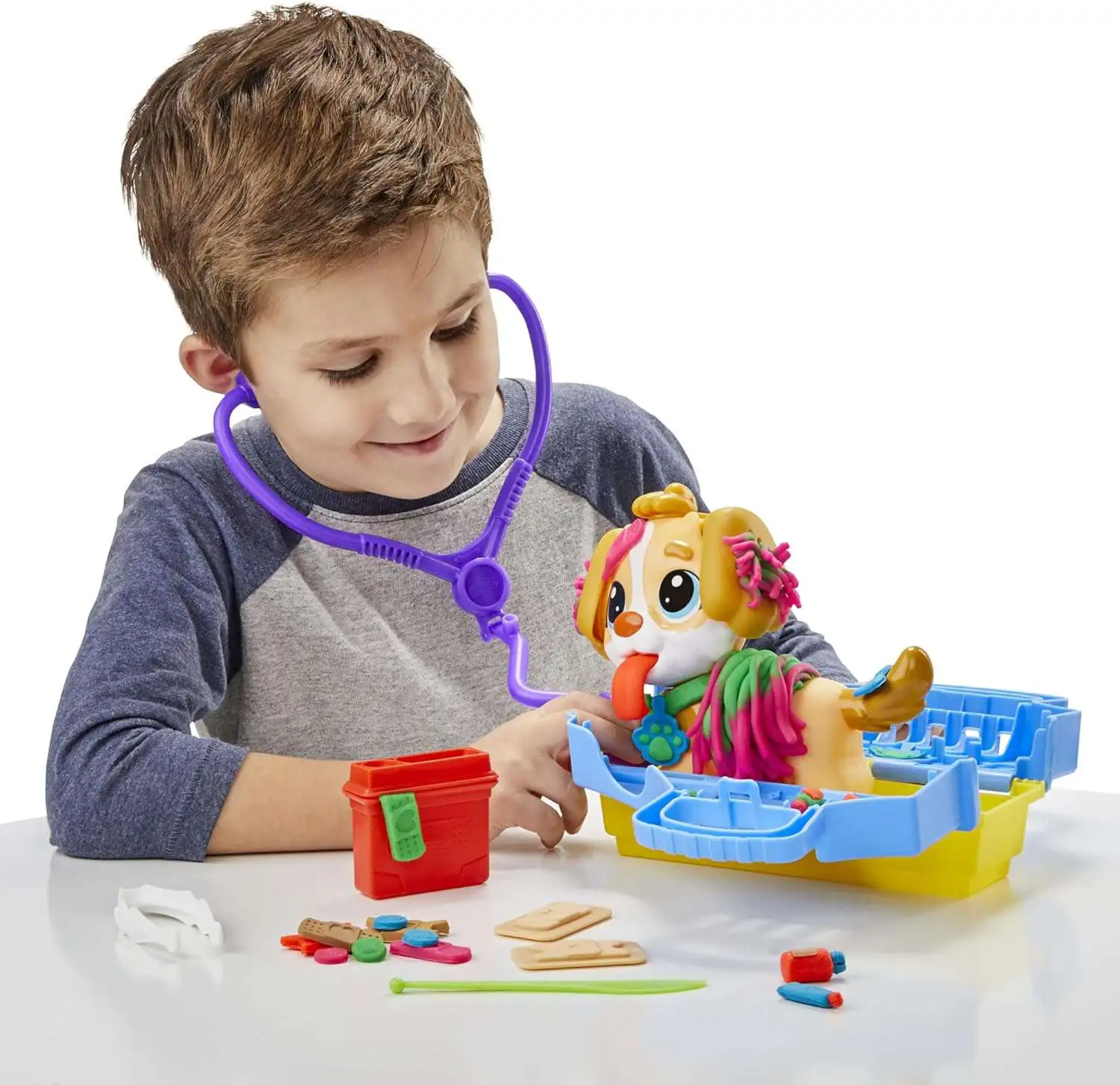 - 10 VET-THEMED PLAY-DOH TOOLS: Stamp with the toy stethoscope, fill in the thermometer, make 5 different bandage styles, give the pup a haircut with the play scissors, and more5 PLAY-DOH CANS: This Play-Doh set has 5 modeling compound cans in blue, pink, orange, brown and green, making it a great birthday gift or other fun present (contains wheat)