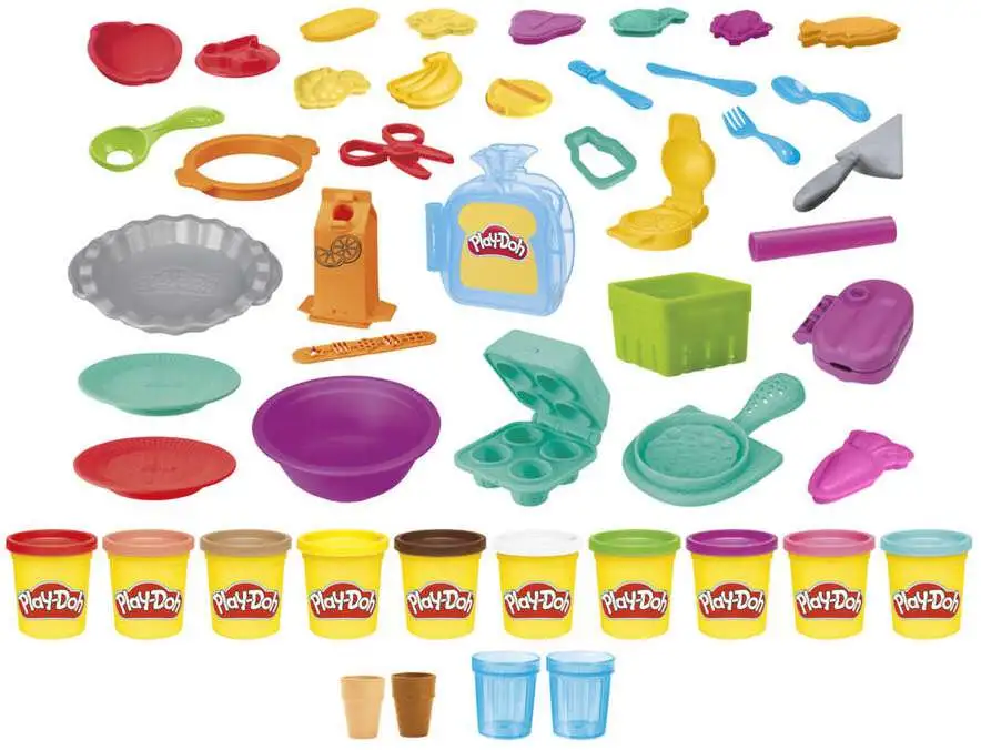 - scissors, roller, serving tool, bowl, knife, fork, 2 spoons, 10 cans of Play-Doh Brand Modeling Compound (total 1 lb 14 oz/850 g)