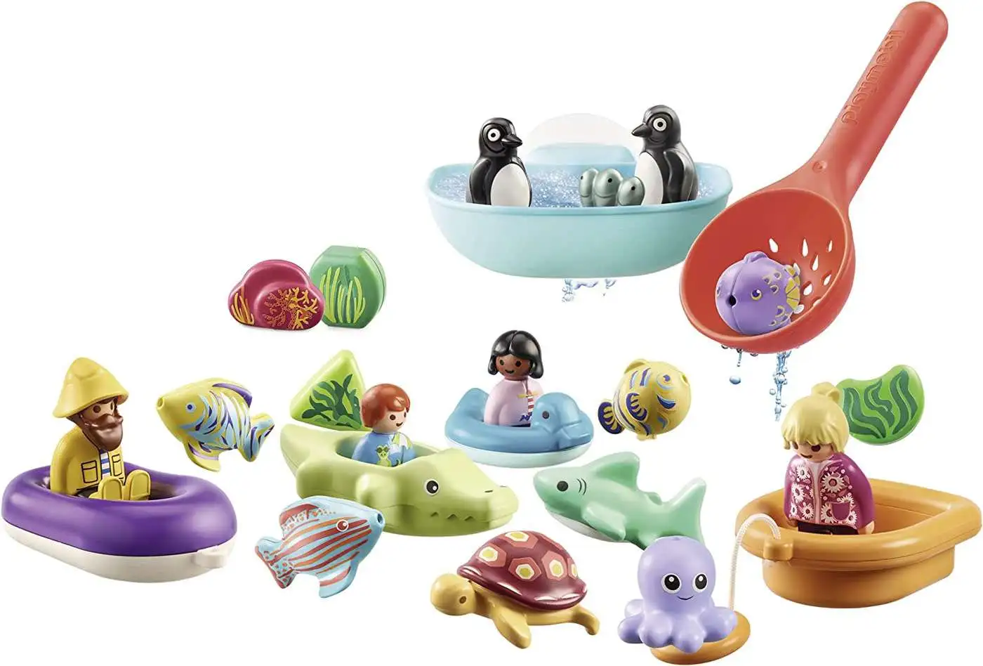 - Figures: 1 sailor, 1 woman, 1 boy, 1 girl; Animals: 2 puffer fish, 2 fish, 1 turtle, 1 baby shark, 1 baby octopus, 1 herring, 2 penguins; Accessories: 1 landing net, 1 collection tray with suction cup attachment, 1 boat, 1 inflatable boat, 1 crocodile boat, 1 floating hoop, 1 coral, 3 water plants