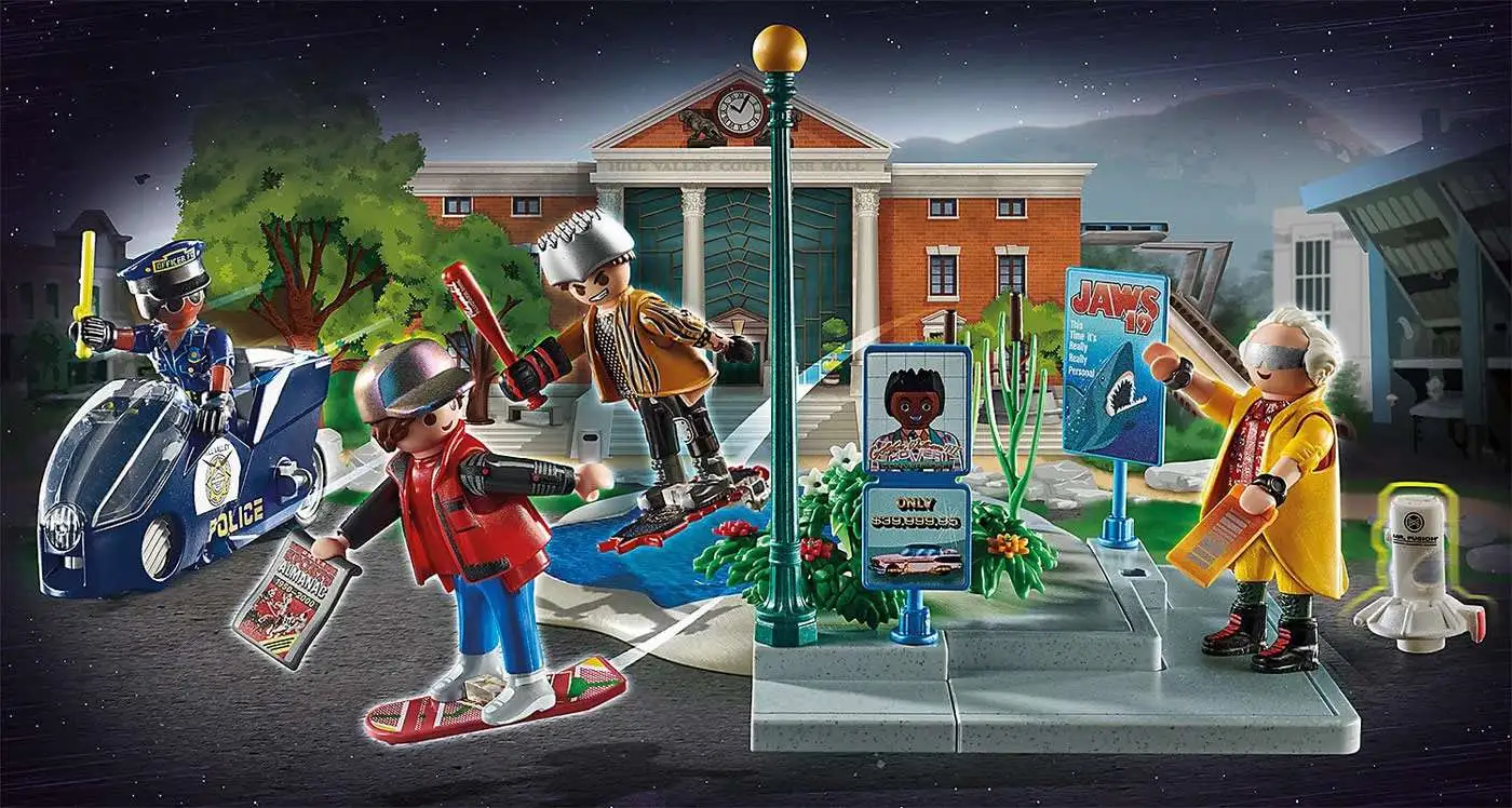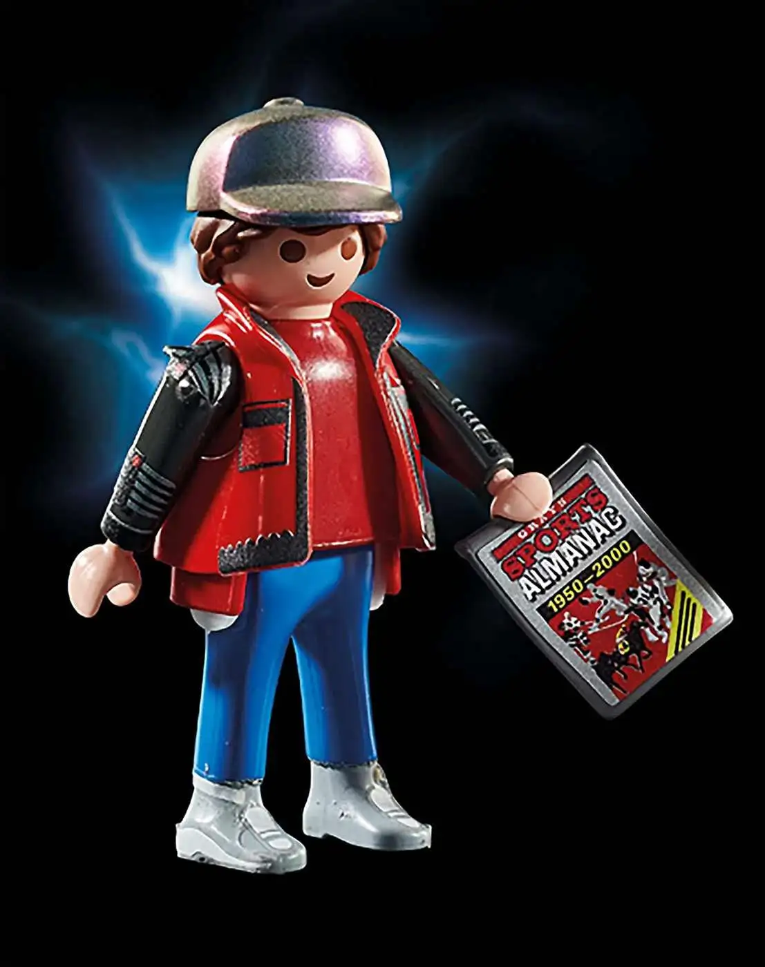 - Figures: 1 Marty McFly 2015, 1 Dr. Emmett Brown 2015, 1 Griff Tannen 2015, 1 policewoman Accessories: 1 city backdrop with pond, 1 police motorcycle, 1 DeLorean supplement 'Mr. Fusion', 1 DeLorean supplement, 1 note, 1 almanac, 2 hoverboards, 2 hoverboard stands, 2 wristwatches, 1 short coat, 1 police hat, 1 cap, 1 baton, 1 baseball bat, 1 pair of police gloves, 1 glove, 1 postcard with lenticular effect