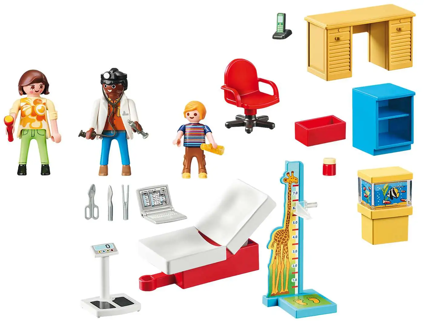 figures: 1 doctor, 1 woman, 1 boy Accessories: 1 treatment couch, 1 chair, 1 desk, 1 telephone, 1 laptop, 1 flashlight, 1 head lamp, 1 stethoscope, 1 box, 1 shelf, 1 box, 1 bottle, 1 aquarium, 1 set of surgical instruments, 1 personal scale, 1 measuring bar