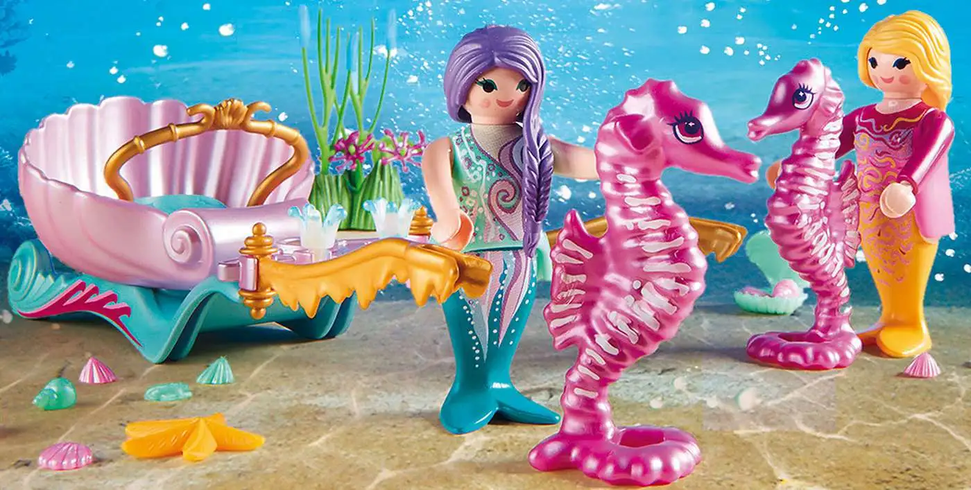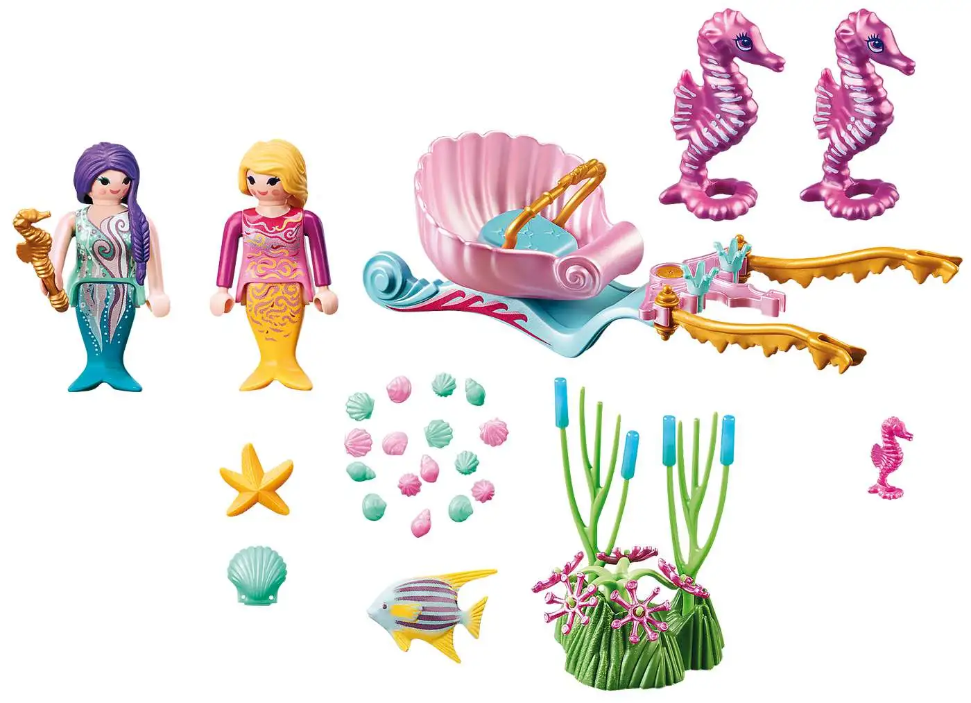 Figures: 2 mermaids Animals: 1 starfish, 2 seahorses, 1 baby seahorse, 1 shell, 16 small shells, 1 fish Accessories: 1 sceptre, 1 carriage, 1 sea plant