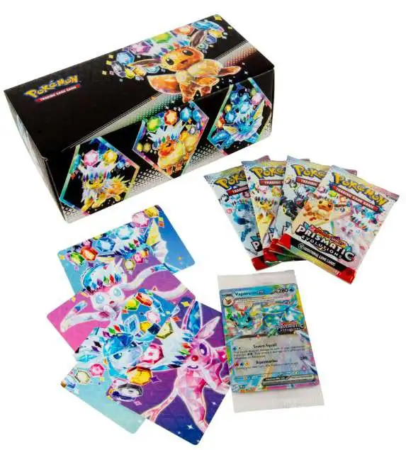 Eevee and its Evolutions all have unique strengths to discoverand they get even more powerful when they appear as Pokémon ex! In this collection, you get one randomly selected foil promo card featuring Eevee or one of its Evolutions as a Stellar Tera Pokémon ex, plus four booster packs from the special Scarlet & VioletPrismatic Evolutions expansion. Then use the included dividers to organize and store your new cards inside this box!