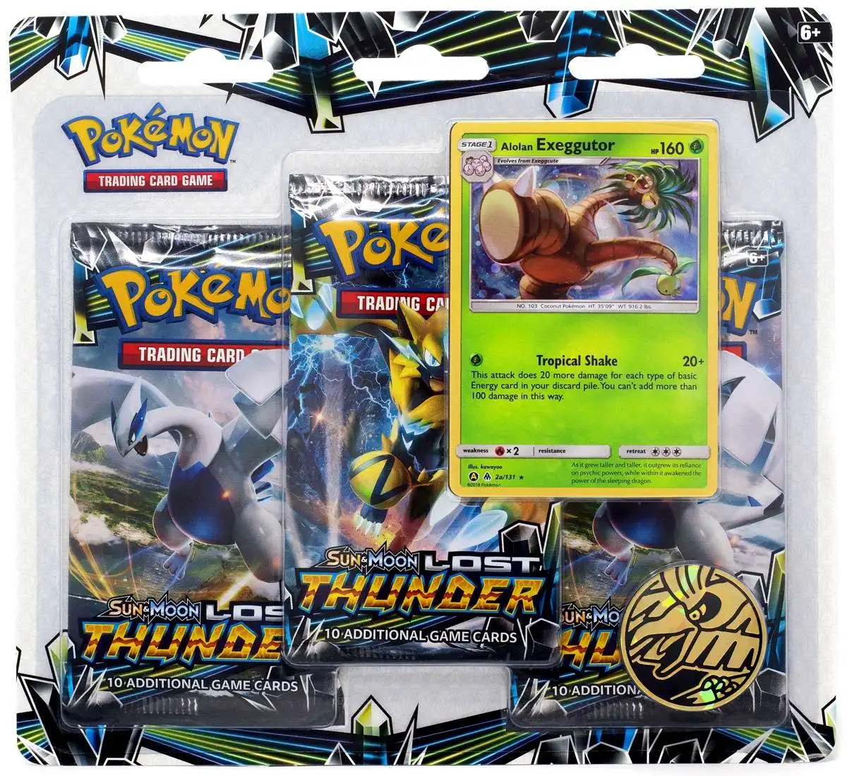 This Pokémon TCG set includes 3 Pokémon TCG: Sun & MoonLost Thunder booster packs, a special foil Alolan Exeggutor promo card, a cool Pokémon coin to add to your collection, and a code card for the Pokémon TCG Online!